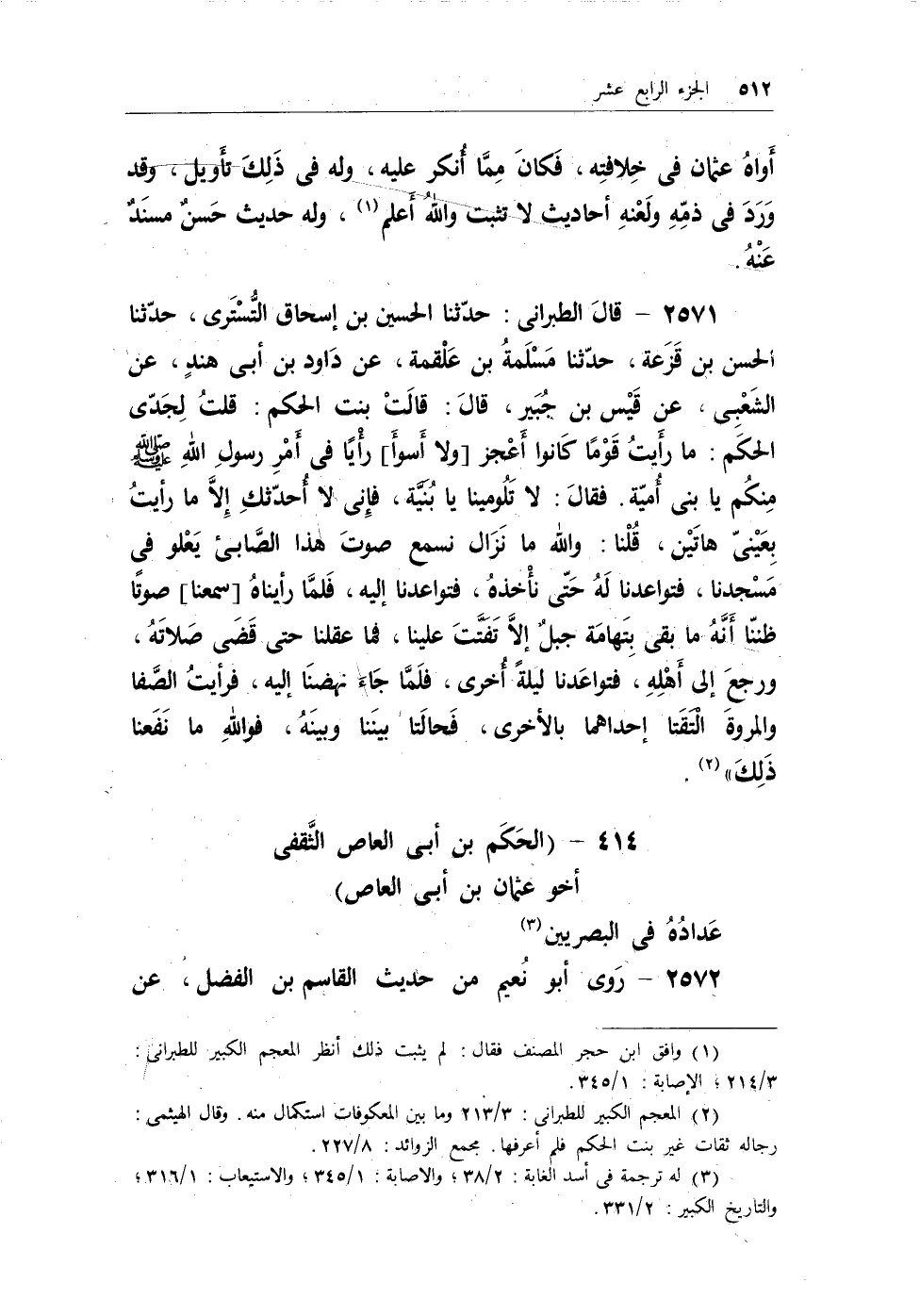2571 - قال الطبراني: حدثنا الحسين بن إسحاق التُّستري، حدثنا الحسن ابن قزعة، حدثنا مسلمةُ بن علقمة، عن داود بن أبي هندٍ، عن الشعبي، عن قيس ابن جُبير، قال: قالت بنت الحكم: قلتُ لجدي الحكم: ما رأيتُ قوماً كانوا أعجز [ولا أسوأ] رأياً في أمر رسول الله - صلى الله عليه وسلم - منكم يابني أُمية. فقال: لا تلومينا يابنية، فإني لا أُحدثكِ إلا ما رأيتُ بعيني هاتين، قلنا: والله ما نزال نسمع صوت هذا الصابئ يعلو في مسجدنا، فتواعدنا لهُ حتى نأخذهُ، فتواعدنا إليه، فلما رأيناهُ [سمعنا] صوتاً ظننا أنه ما بقي بتهامة جبلٌ إلا تفتت علينا، فما عقلنا حتى قضى صلاتهُ، ورجع إلى أهله، فتواعدنا ليلةً أُخرى، فلما جاء نهضنا إليه، فرأيتُ الصفا والمروة التقتا إحداهما بالأخرى، فحالتا بيننا وبينهُ، فوالله ما نفعنا ذلك) (¬1) .