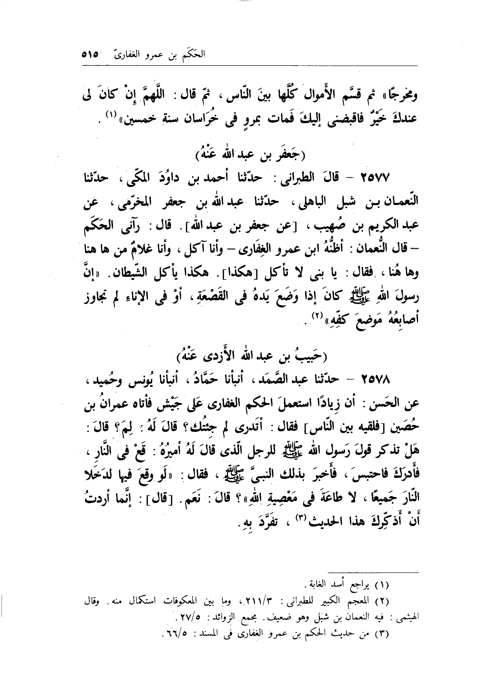 2578 - حدثنا عبد الصمد، أنبأنا حمادُ، أنبأنا يُونس وحُميد، عن الحسن: أن زياداً استعمل الحكم الغفاري على جيش فأتاه عمرانُ بن حُصين [فلقيه بين الناس] فقال: أتدري لم جئتك؟ قال لهُ: لِمَ؟ قال: هذ تذكر قول رسول الله - صلى الله عليه وسلم - للرجل الذي قال لهُ أميرهُ: قع في النار، فأدرك فاحتبس، فأخبر بذلك النبي - صلى الله عليه وسلم -، فقال: (لو وقع فيها لدخلا النار جميعاً، لا طاعة في معصية الله) ؟ قال: نعم. [قال] : إنما أردتُ أن أذكرك هذا الحديث (¬2) ، تفرد به.