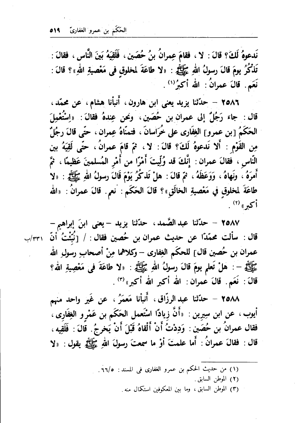 2586 - حدثنا يزيد يعني ابن هارون، أنبأنا هشام، عن محمد، قال: جاء رجلٌ إلى عمران بن حُصين، ونحن عندهُ فقال: (استعمل الحكم [بن عمرو] الغفاري على خُراسان، فتمناهُ عمران، حتى قالَ رجلٌ من القوم: ألا ندعوهُ لك؟ قال: لا، ثم قام عمران، حتى لقيهُ بين الناس، فقال عمران: إنك قد وُليتَ أمراً من أمر المسلمين عظيماً، ثم أمرهُ، ونهاهُ، ووعطهُ، ثم قال: هل تذكُرُ يوم قال رسول الله - صلى الله عليه وسلم -:) لا طاعة لمخلوقٍ في معصية الخالق (؟ قال الحكم: نعم. قال عمرانُ: (الله أكبر) (¬1) .