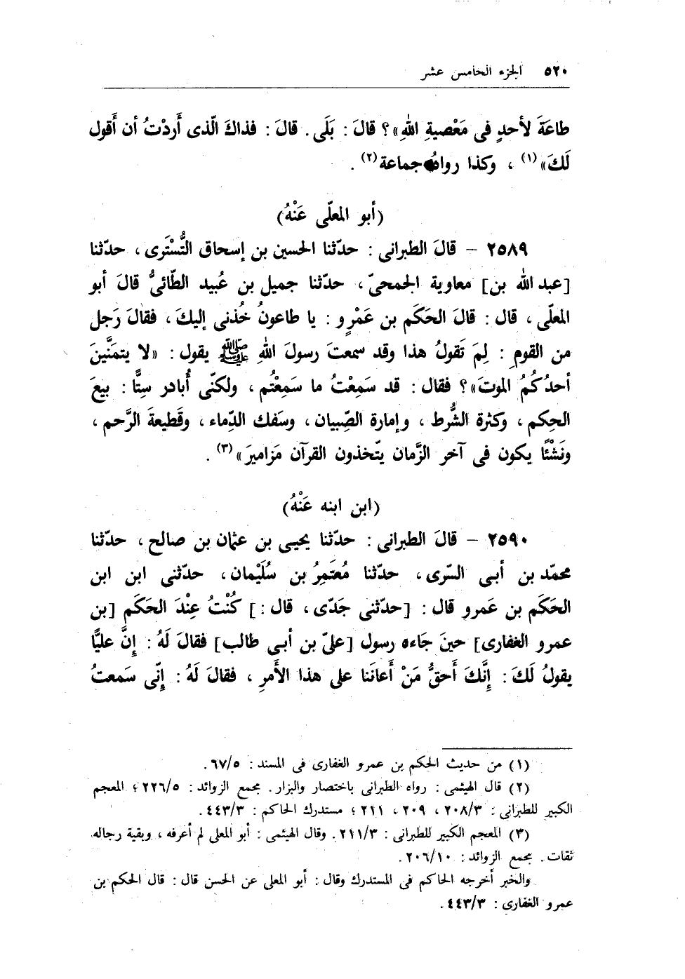 2589 - قال الطبراني: حدثنا الحسين بن إسحاق التُّستري، حدثنا [عبد الله بن] معاوية الجمحي، حدثنا جميل بن عُبيد الطائيُّ قال أبو المعلى، قال: قال الحكم بن عمرو: يا طاعونُ خُذني إليك، فقال رجل من القوم: لم تقولُ هذا وقد سمعت رسول الله - صلى الله عليه وسلم - يقول: (لا يتمنين أحدُكُمُ الموت) ؟ فقال: قد سمعتُ ما سمعتُم، ولكني أُبادر ستاً: بيعَ الحكم، وكثرة الشُّرط، وإمارة الصبيان، وسفك الدماء، وقطيعة الرحم، ونشئاً يكون في آخر الزمان يتخذون القرآن مزامير) (¬1) .