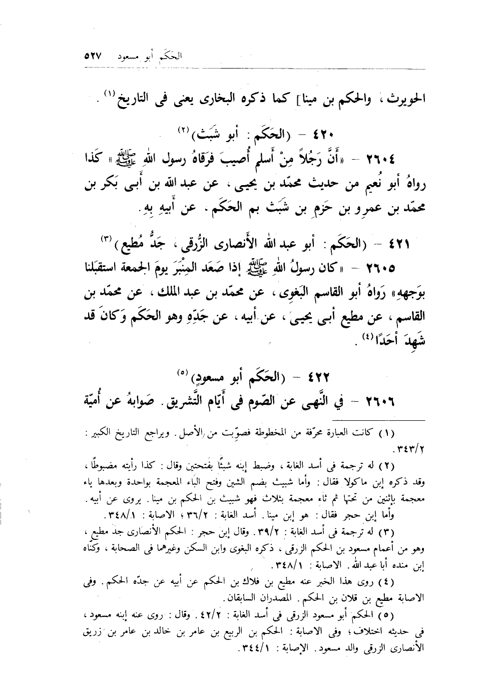 (¬4) الحكم أبو مسعود الزرقي في أسد الغابة: 2/42. وقال: روى عنه ابنه مسعود، في حديثه اختلاف؛ وفي الإصابة: الحكم بن الربيع بن عامر بن خالد بن عامر بن رزيق الأنصاري الزرقي والد مسعود. الإصابة: 1/344.