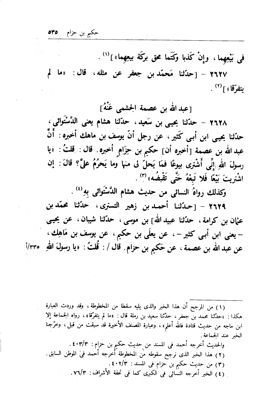 2628 - حدثنا يحيى بن سعيد، حدثنا هشام يعني الدستوائي، حدثنا يحيى ابن أبي كثير، عن رجل أن يوسف بن ماهك أخبره: أنَّ عبد الله بن عصمة [أخبره أن] حكيم بن حزامٍ أخبره. قال: قلتُ: (يا رسول الله إني أشتري بيوعاً فما يحل لي منها وما يحرمُ عليَّ؟ قال: إن اشتريت بيعاً فلا تبعهُ حتى تقبضُه) (¬2) .