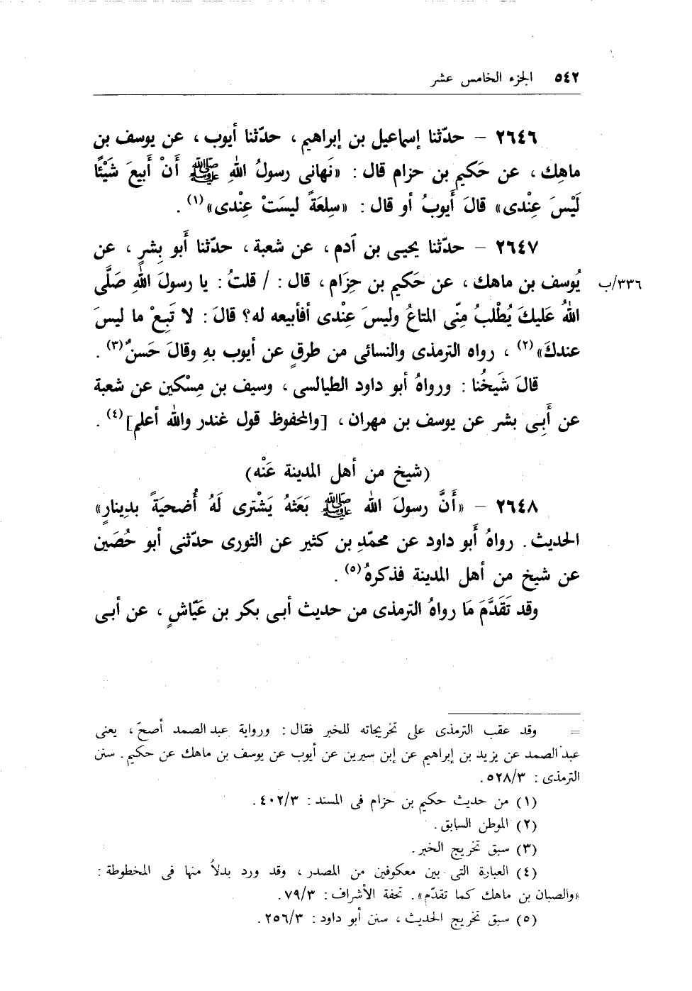 2647 - حدثنا يحيى بن آدم، عن شعبة، حدثنا أبو بشرٍ، عن يُوسف بن ماهك، عن حكيم بن حزام، قال: / قلتُ: يارسول الله صلى الله عليك يُطلبُ مني المتاعُ وليس عندي أفأبيعه له؟ قال: لا تبع ما ليس عندك) (¬2) ، رواه الترمذي والنسائي من طرقٍ عن أيوب بهِ وقال حسنٌ (¬3) .