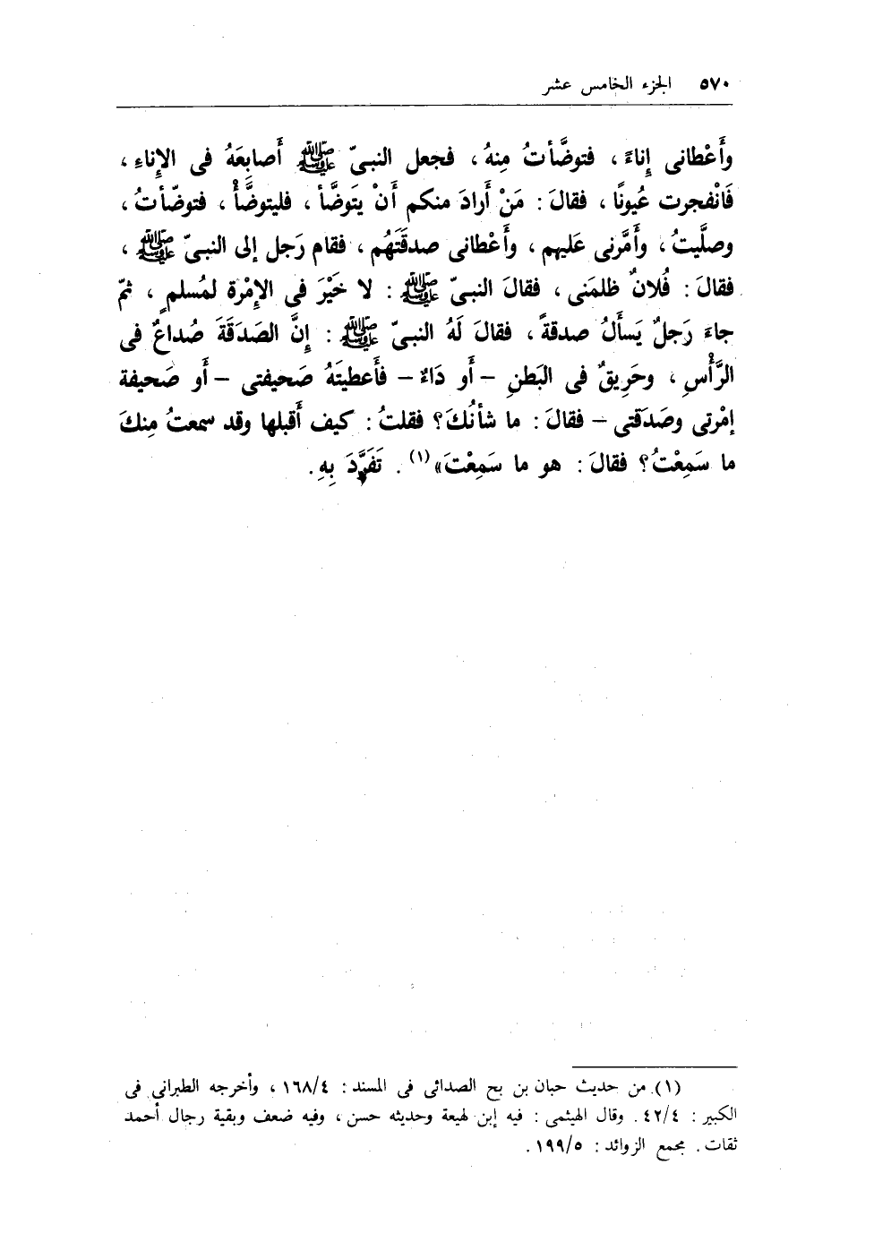 وأعطاني إناء، فتوضأتُ منهُ، فجعل النبي - صلى الله عليه وسلم - أصابعهُ في الإناء، فانفجرت عُيوناً، فقال: من أراد منكم أن يتوضأ، فليتوضأ، فتوضأتُ، وصليتُ، وأمرني عليهم، وأعطاني صدقتهم، فقام رجل إلى النبي - صلى الله عليه وسلم -، فقال: فُلانٌ ظلمني، فقال النبي - صلى الله عليه وسلم -: لا خير في الإمرة لمُسلمٍ، ثم جاء رجلٌ يسألُ صدقةً، فقال لهُ النبي - صلى الله عليه وسلم -: إن الصدقة صداعٌ في الرأس، وحريقٌ في البطن - أو داءٌ - فأعطيتهُ صحيفتي - أو صحيفة إمرتي وصدقتي - فقال: ما شأنك؟ فقلتُ: كيف أقبلها وقد سمعتُ منك ما سمعتُ؟ فقال: هو ما سمعت) (¬1) . تفرد به.