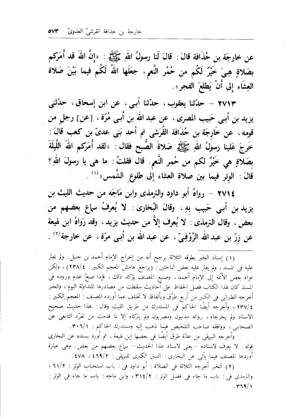 2713 - حدثنا يعقوب، حدثنا أبي، عن ابن إسحاق، حدثني يزيد بن أبي حبيب المصري، عن عبد الله بن أبي مرة، [عن] رجلٍ من قومه، عن خارجة بن حُذافة القُرشي ثم أحد بني عدي بن كعب قال: خرج علينا رسول الله - صلى الله عليه وسلم - صلاة الصُّبح فقال: (لقد أمركم الله الليلة بصلاةٍ هي خيرٌ لكم من حُمر النَّعم. قال فقلتُ: ماهي يارسول الله؟ قال: الوتر فيما بين صلاة العشاء إلى طلوع الشمس) (¬1) .