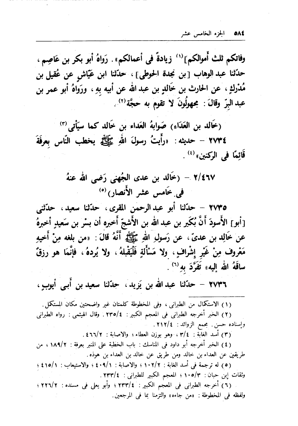 2735 - حدثنا أبو عبد الرحمن المقري، حدثنا سعيد، حدثني [أبو] الأسود أن بُكير بن عبد الله بن الأشج أخبره أن بسر بن سعيدٍ أخبرهُ عن خالد بن عدي، عن رسول الله - صلى الله عليه وسلم - أنهُ قال: (من بلغه من أخيه معروف من غير إشرافٍ، ولا مسألةٍ