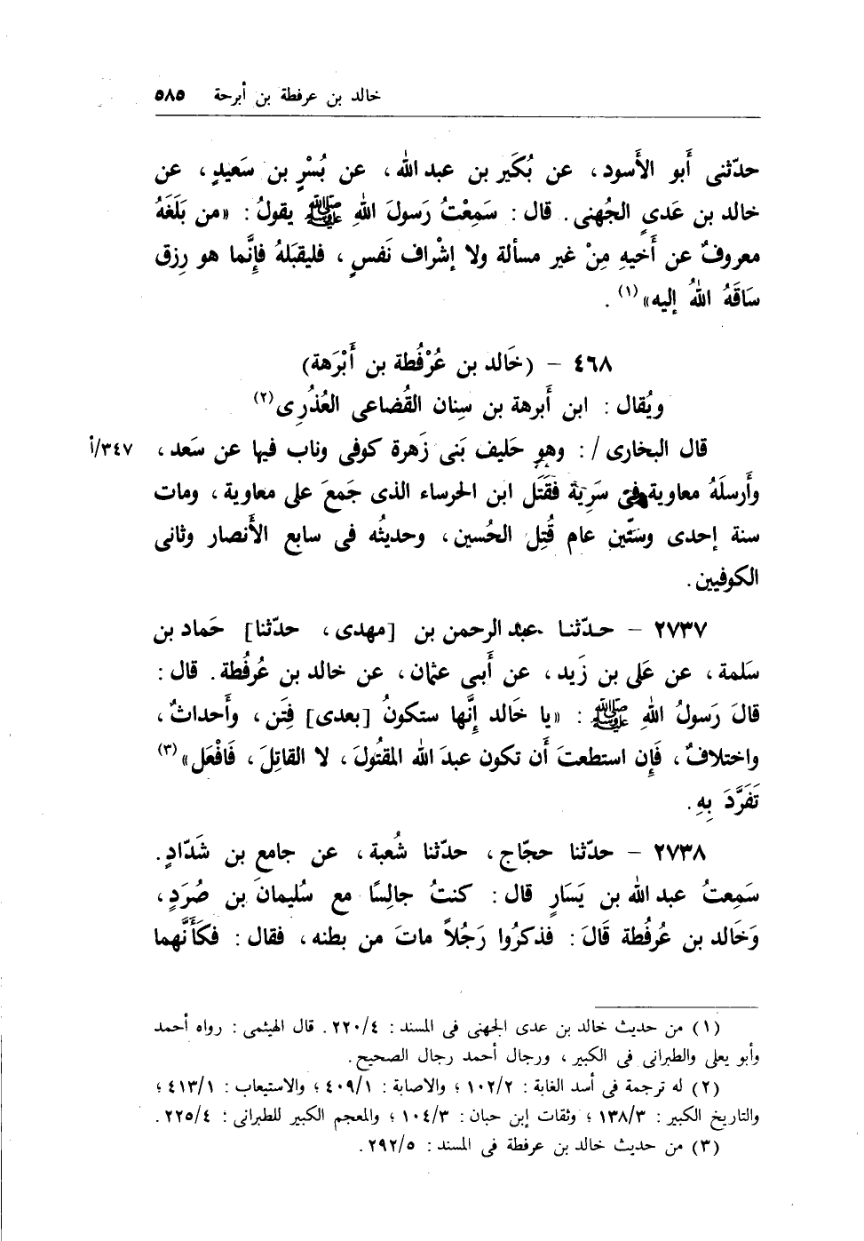 2737 - حدثنا عبد الرحمن بن [مهدي، حدثنا] حماد بن سلمة، عن علي ابن زيد، عن أبي عثمان، عن خالد بن عُرفطة. قال: قال رسول الله - صلى الله عليه وسلم -: (ياخالد إنها ستكونُ [بعدي] فِتَن، وأحداثٌ واختلافٌ، فإن استطعت أن تكون عبد الله المقتول، لا القاتل، فافعل) (¬2) تفرد به.