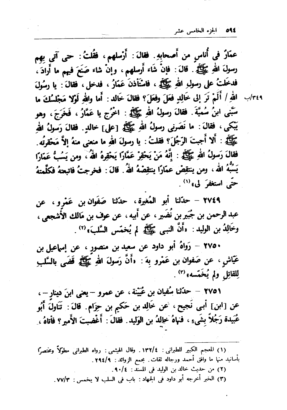 2751 - حدثنا سُفيان بن عُيينة، عن عمرو - يعني ابن دينار -، عن [ابن] أبي نجيح، عن خالد بن حكيم بن حزام. قال: تناول أبو عبيدة رجلاً بشئ، فنهاهُ خالدُ بن الوليد. فقال: أغضبت الأمير؟ فأتاهُ،