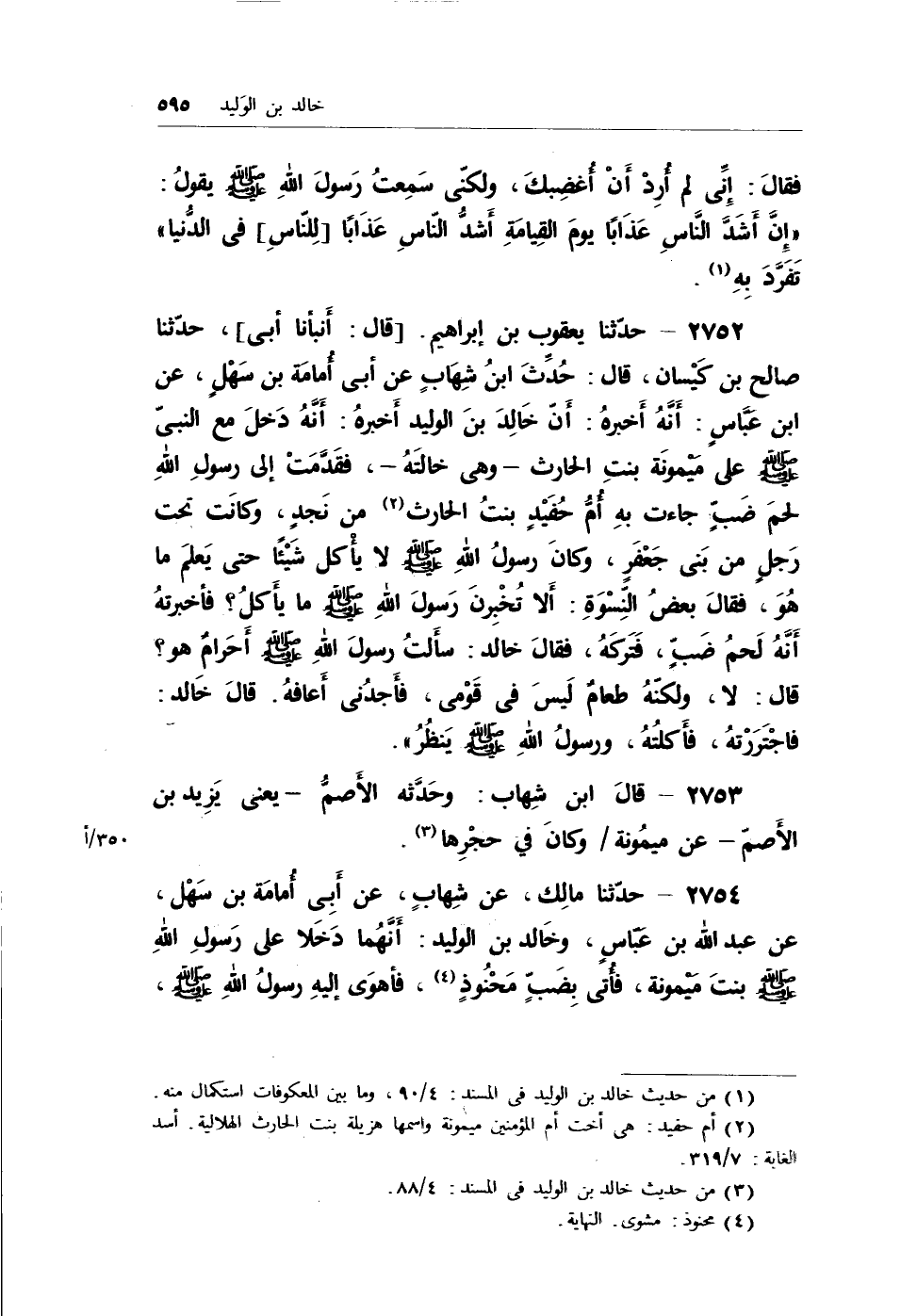 2752 - حدثنا يعقوب بن إبراهيم. [قال: أنبأنا أبي] ، حدثنا صالح بن كيسان، قال: حُدِّثَ ابنُ شهابٍ عن أبي أمامة بن سهلٍ، عن ابن عباسٍ: أنه أخبره: أن خالد بن الوليد أخبرهُ: أنه دخل مع النبي - صلى الله عليه وسلم - على ميمونة بنت الحارث - وهي خالتهُ -، فقدمتْ إلى رسول الله لحم ضبٍ جاءت به أم حُفيدٍ بنت الحارث (¬1) من نجدٍ، وكانت تحت رجلٍ من بني جعفر، وكان رسول الله - صلى الله عليه وسلم - لا يأكل شيئاً حتى يعلم ما هو، فقال بعض النسوة: ألا تخبرن رسول الله - صلى الله عليه وسلم - ما يأكل؟ فأخبرتهُ أنه لحم ضبٍ، فتركه، فقال خالد: سألتُ رسول الله - صلى الله عليه وسلم - أحرامٌ هو؟ قال: لا، ولكنه طعامٌ ليس في قومي، فأجدُني أعافهُ. قال خالد: فاجتررتهُ، فأكلتهُ، ورسول الله - صلى الله عليه وسلم - ينظُرُ) .