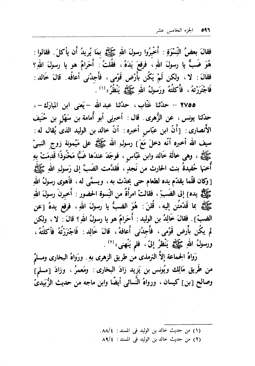 2755 - حدثنا عتاب، حدثنا عبد الله - يعني ابن المبارك-، حدثنا يونس، عن الزهري. قال: أخبرني أبو أُمامة بن سهلٍ بن حُنيف الأنصاري: [أن ابن عباسٍ أخبره: أنّ خالد بن الوليد الذي يُقال له: سيف الله أخبره أنه دخل مع] رسول الله - صلى الله عليه وسلم - على ميمونة زوج النبي - صلى الله عليه وسلم -، وهي خالة خالد وابن عباسٍ، فوجد عندها ضباً محنوذاً قدمت بهِ أُختها حفيدةُ بنت الحارث من نجدٍ، فقدمت الضب إلى رسول الله - صلى الله عليه وسلم -[وكان قلما يقدم يده لطعام حتى يحدث به، ويسمى له، فأهوى رسول الله - صلى الله عليه وسلم - يده] إلى الضب، فقالت امرأةٌ من النسوة الحضور: أخبرن رسول الله - صلى الله عليه وسلم - بما قدمتن إليه، قُلنَ: هُو الضبُّ يارسول الله، فرفع يدهُ [عن الضب] . فقال خالدُ بن الوليد: أحرامٌ هو يارسول الله، فرفع يدهُ [عن الضب] . فقال خالد بن الوليد: أحرامٌ هو يارسول الله؟ قال: لا، ولكن لم يكُن بأرض قومي، فأجدني أعافهُ، قال خالد: فاجتررتهُ فأكلتهُ، ورسول الله - صلى الله عليه وسلم - ينظرُ إليّ، فلم ينهني) (¬1) .