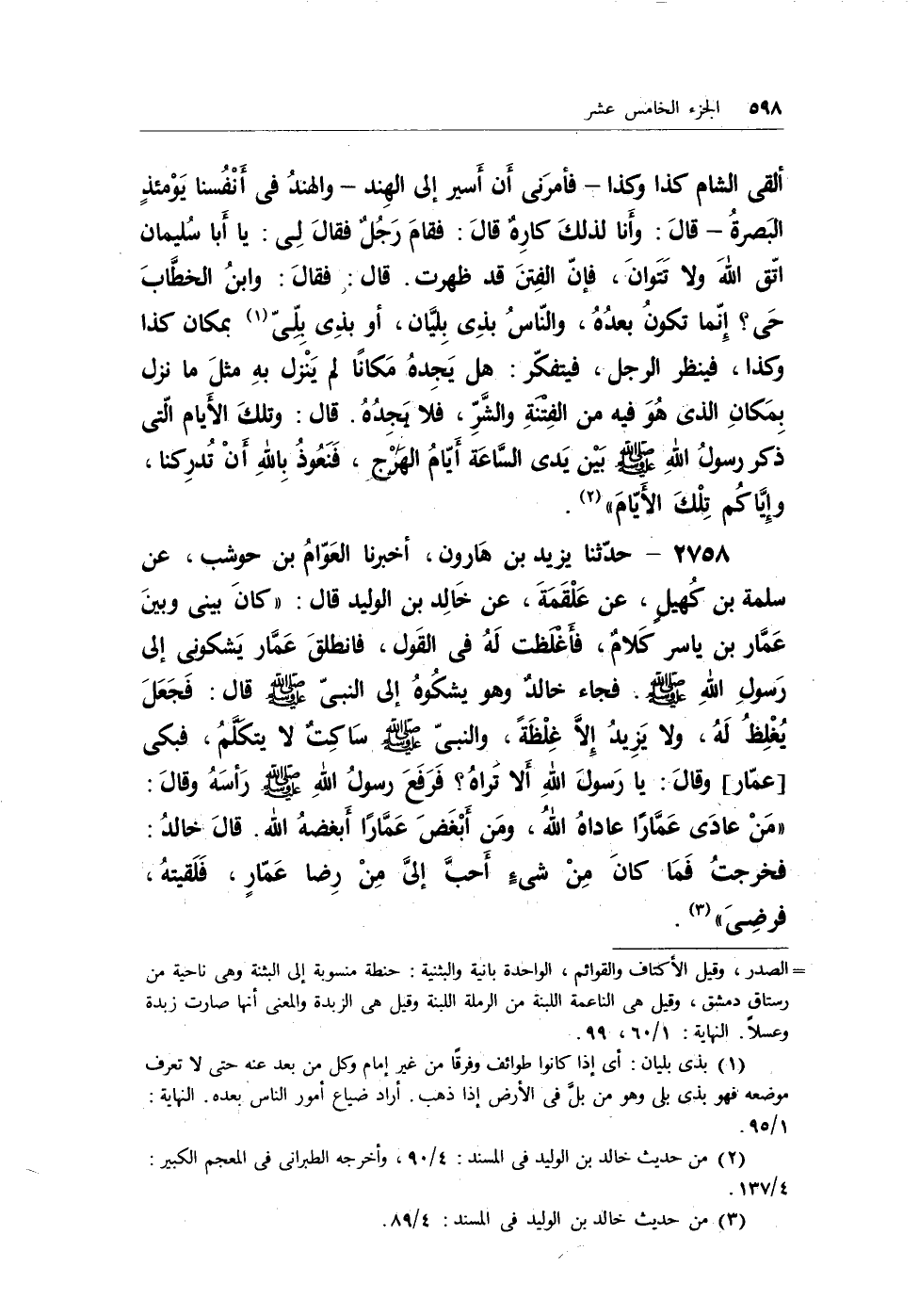 2758 - حدثنا يزيد بن هارون، أخبرنا العوامُ بن حوشب، عن سلمة بن كُهيلٍ، عن علقمة، عن خالد بن الوليد قال: (كان بيني وبين عمار بن ياسر كلامٌ، فأغلظت لهُ في القول، فانطلق عمار يشكوني إلى رسول الله - صلى الله عليه وسلم -. فجاء خالدٌ وهو يشكوهُ إلى النبي - صلى الله عليه وسلم - قال: فجعل يُغلظ لهُ، ولا يزيدُ إلا غلظةً، والنبي - صلى الله عليه وسلم - ساكتٌ لا يتكلمُ، فبكى [عمار] وقال: يارسول الله ألا تراهُ؟ فرفع رسول الله - صلى الله عليه وسلم - رأسهُ وقال: (من عادى عماراً عاداهُ الله، ومن أبغض عماراً أبغضهُ الله. قال خالدُ: فخرجت فما كان من شئٍ أحب إليَّ من رضا عمارٍ، فلقيتهُ، فرضى) (¬1) .
