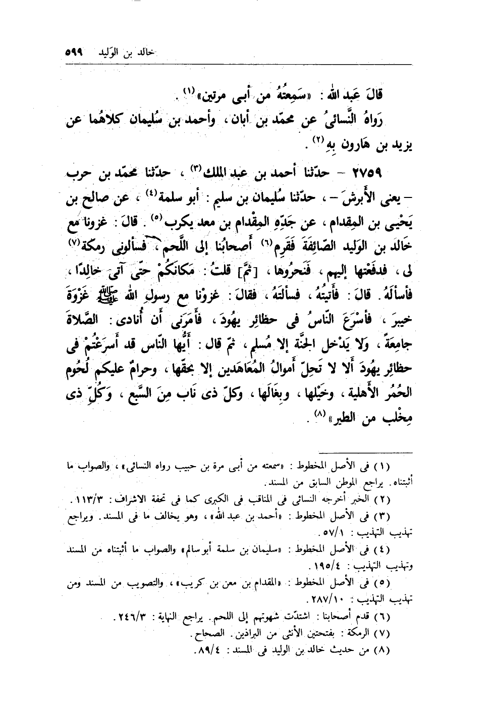 2759 - حدثنا أحمد بن عبد الملك (¬1) ، حدثنا محمد بن حرب - يعني الأبرش -، حدثنا سُليمان بن سليم: أبو سلمة (¬2) ، عن صالح بن يحيى بن المقدام، عن جده المقدام بن معد يكرب (¬3) . قال: غزونا مع خالد بن الوليد الصائفة فقرم (¬4) أصحابنا إلى اللحم، فسألوني رمكة (¬5) لي، فدفعتها إليهم، فنحرُوها، [ثم] قلتُ: مكانكم حتى آتي خالداً، فأسألهُ. قال: فأتيتهُ، فسألتهُ، فقال: غزونا مع رسول الله - صلى الله عليه وسلم - غزوة خيبر، فأسرع الناسُ في حظائر يهود، فأمرني أن أُنادي: الصلاة جامعةً، ولا يدخل الجنة إلا مُسلم، ثم قال: أيُّها الناس قد أسرعتُم في حظائر يهود ألا لا تحل أموالُ المُعاهدين إلا بحقها، وحرامٌ عليكم لُحُوم الحُمُر الأهلية، وخيلها، وبغالها، وكل ذي ناب من السبع، وكل ذي مخلب من الطير) (¬6) .