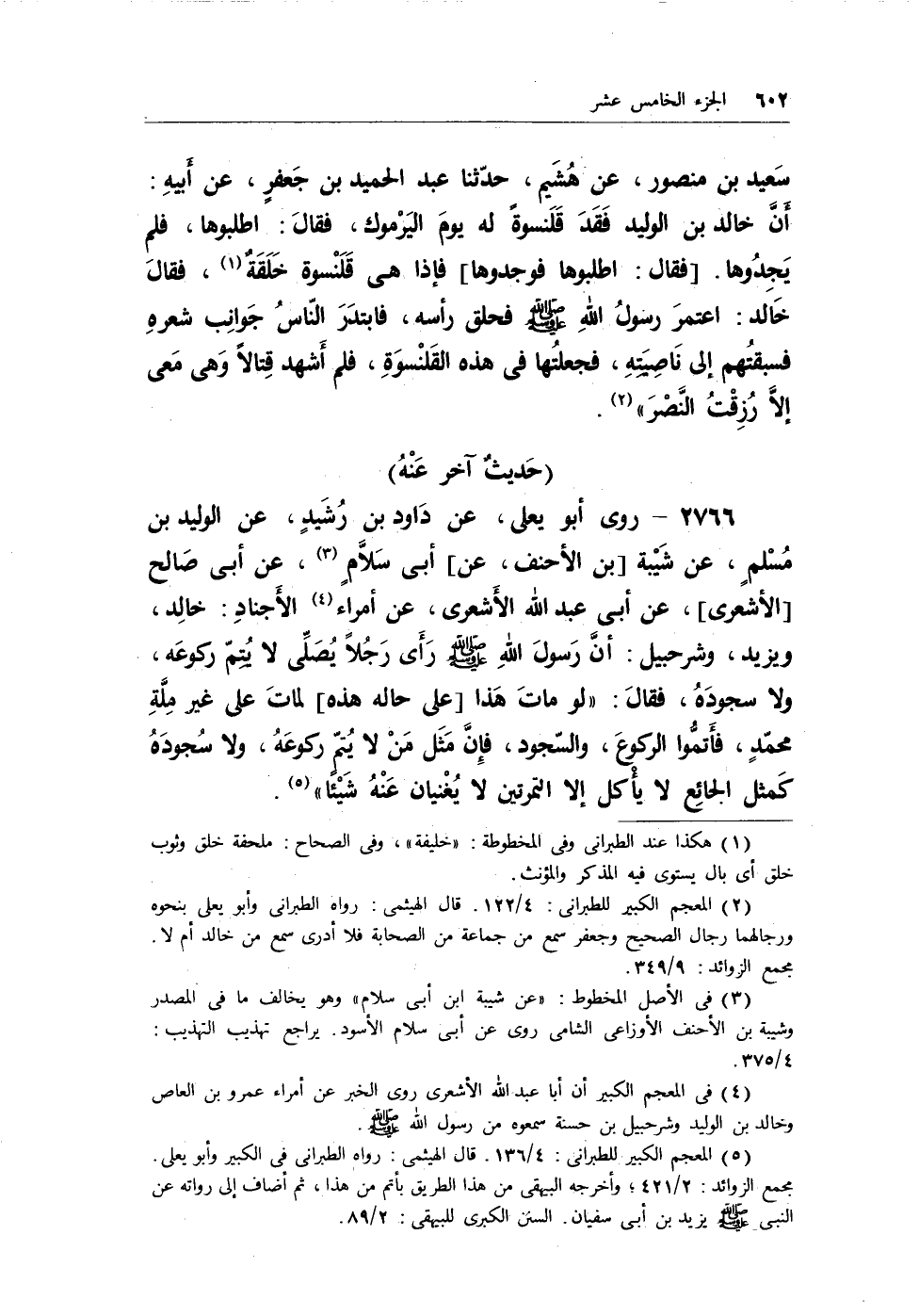 (¬2) المعجم الكبير للطبراني: 4/122. قال الهيثمي: رواه الطبراني وأبو يعلى بنحوه ورجالهما رجال الصحيح وجعفر سمع من جماعة من الصحابة فلا أدري سمع من خالد أم لا. مجمع الزوائد: 9/349.