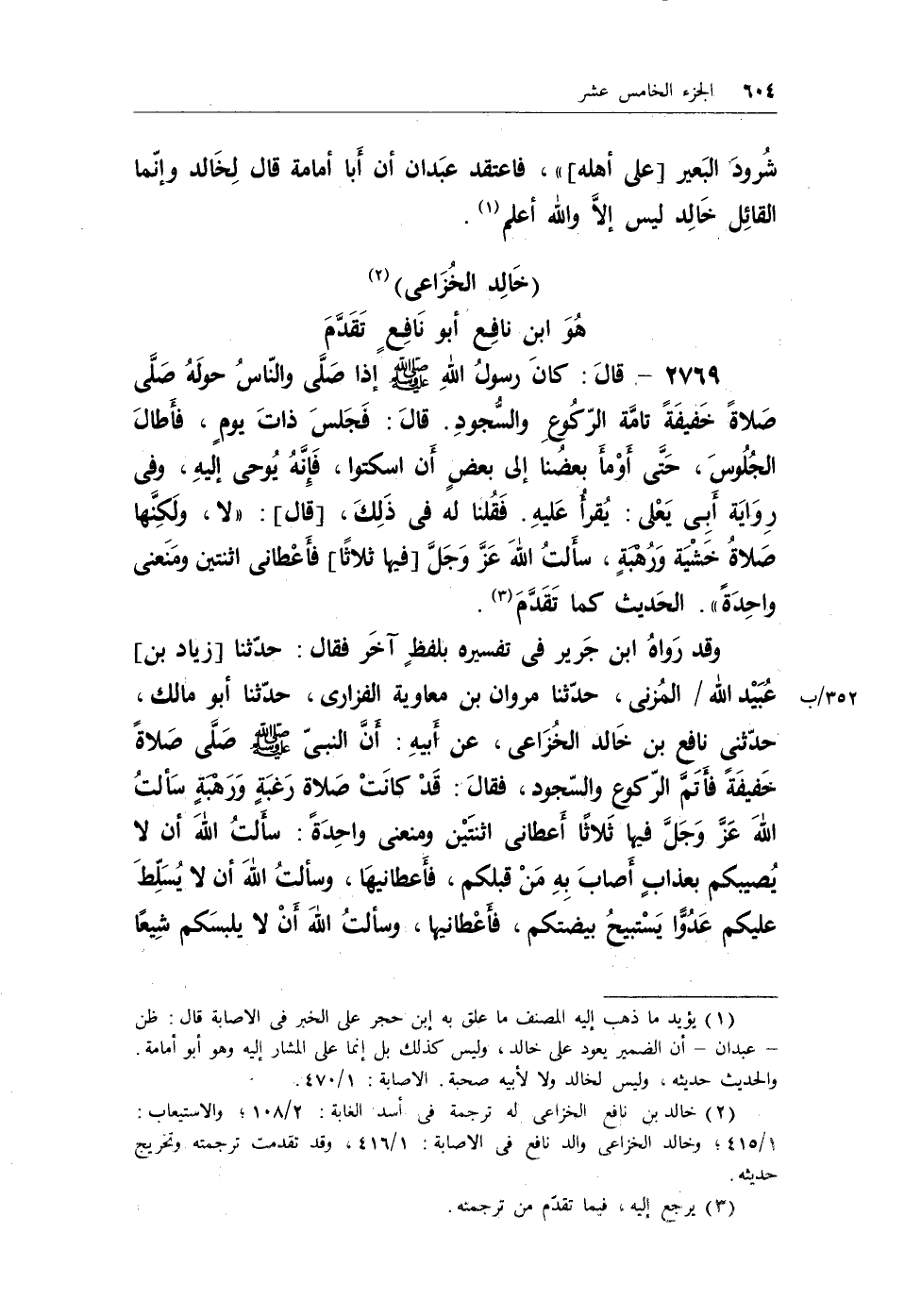 (¬2) خالد بن نافع الخزاعي له ترجمة في أسد الغابة: 2/108؛ والاستيعاب: 1/415؛ وخالد الخزاعي والد نافع في الإصابة: 1/416، وقد تقدمت ترجمته وتخريج حديثه.