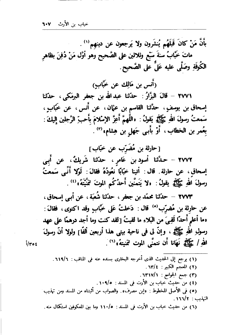 2772 - حدثنا أسود بن عامرٍ، حدثنا شريكٌ، عن أبي إسحاق، عن حارثة. قال: أتينا خباباً نُعودُهُ فقال: لولا أني سمعتُ رسول الله - صلى الله عليه وسلم - يقولُ: (لايتمنين أحدكم الموت لتمنيتهُ) (¬2) .