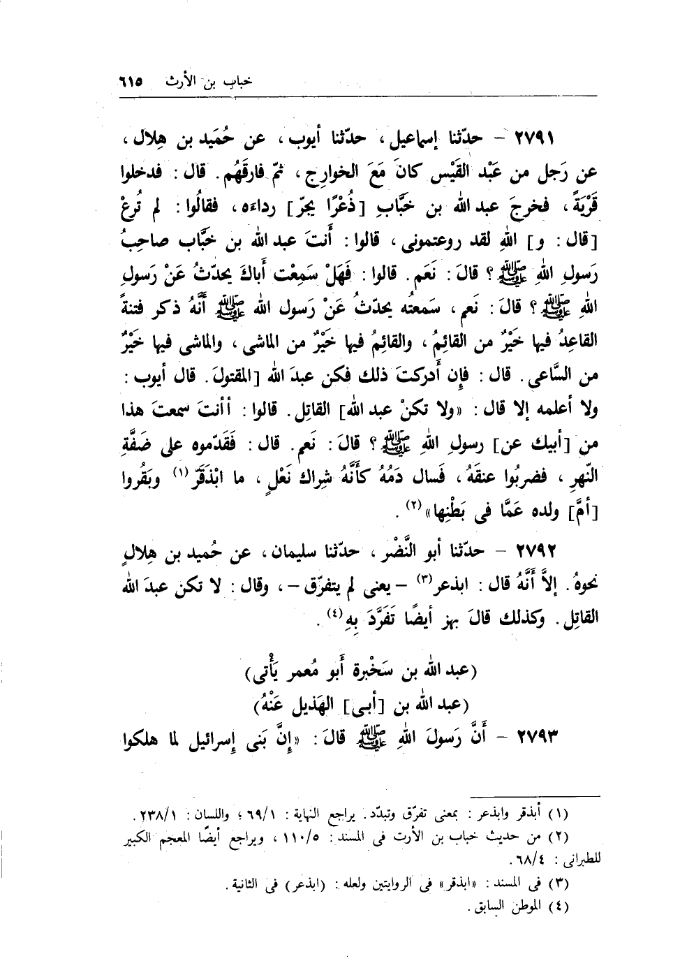 2792 - حدثنا أبو النضر، حدثنا سليمان، عن حُميد بن هلالٍ نحوه. إلا أنهُ قال: ابذعر (¬3) - يعني لم يتفرق -، وقال: لا تكن عبد الله القاتل. وكذلك قال بهز أيضاً تفرد بهِ (¬4) .
