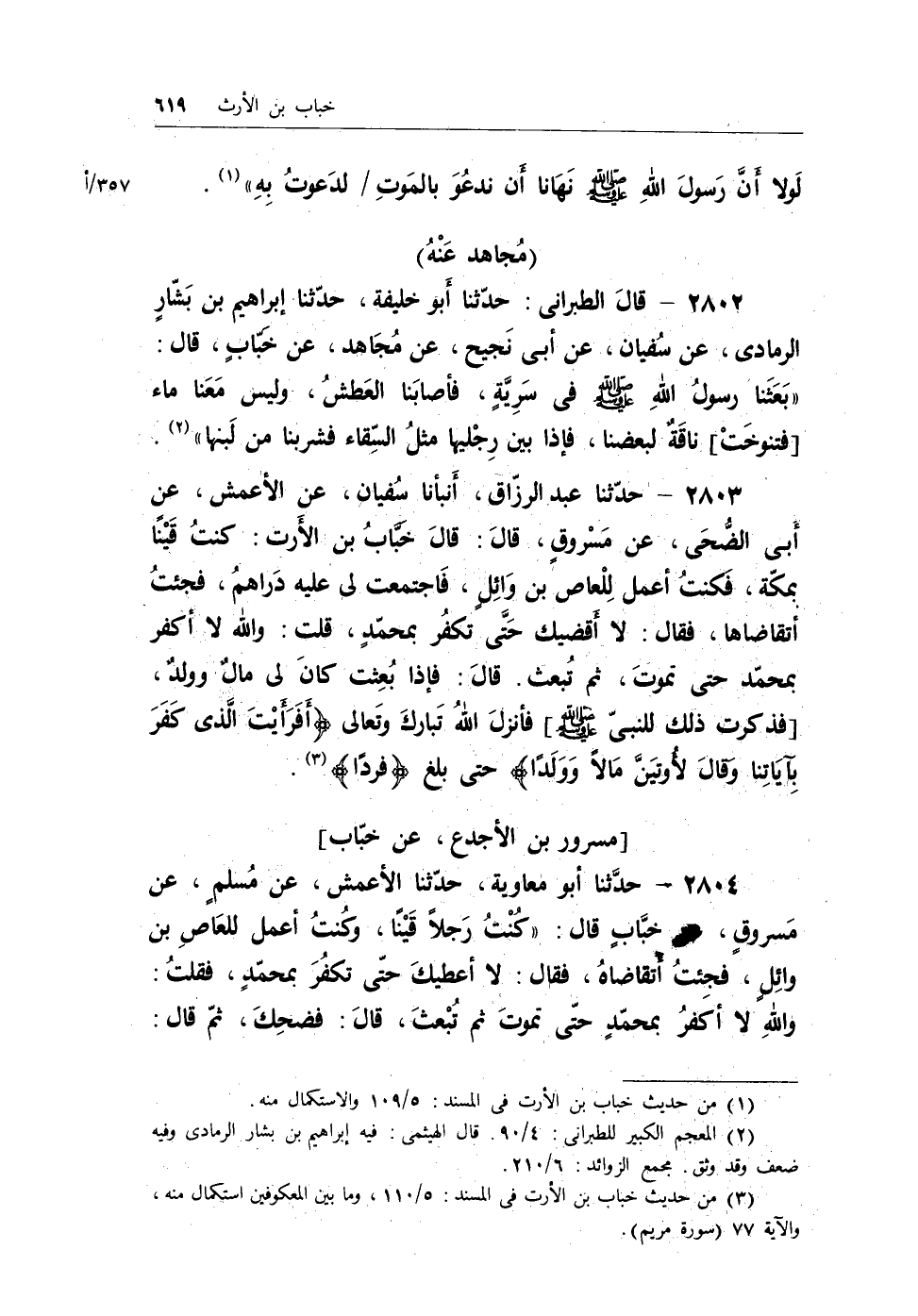 (¬1) المعجم الكبير للطبراني: 4/90. قال الهيثمي: فيه إبراهيم بن بشار الرمادي وفيه ضعف وقد وثق. مجمع الزوائد: 6/210.