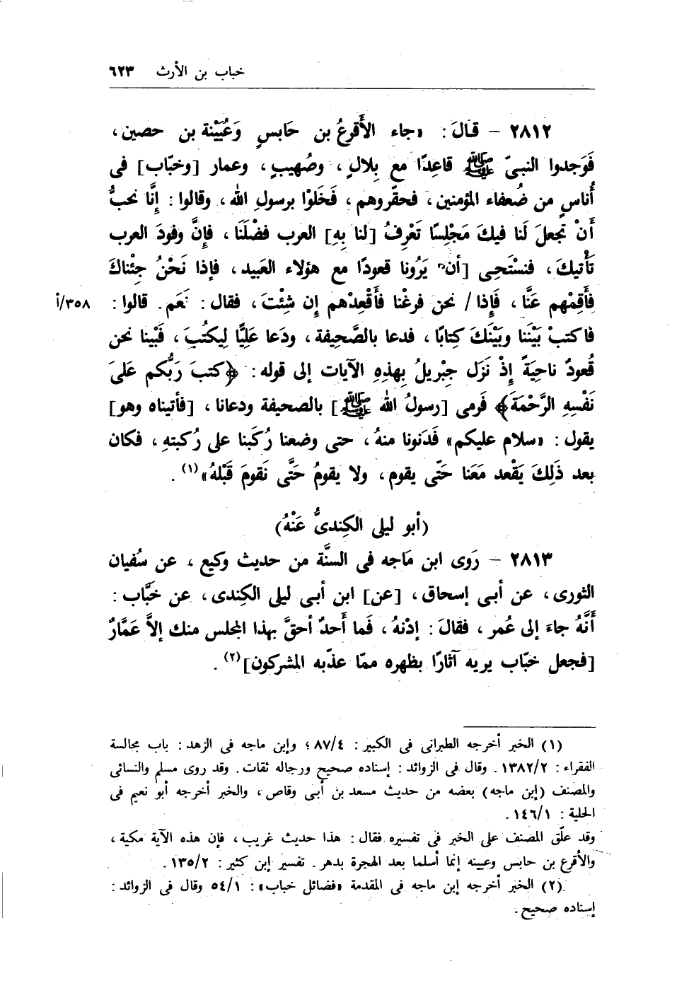 2813 - روى ابن ماجه في السنة من حديث وكيع، عن سُفيان الثوري، عن أبي إسحاق، [عن] ابن أبي ليلى الكندي، عن خباب: أنهُ جاء إلى عُمر، فقالَ: إدنهُ، فما أحدٌ أحق بهذا المجلس منك إلاَّ عمارٌ [فجعل خباب يريه آثاراً بظهره مما عذبه المشركون] (¬2) .
