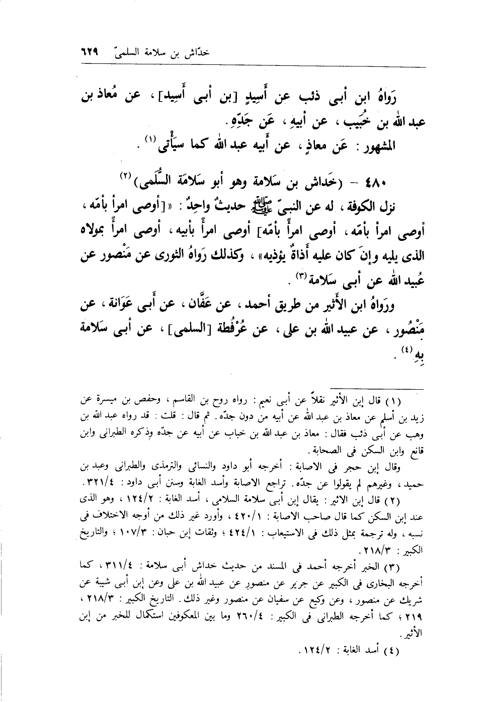 ورواهُ ابن الأثير من طريق أحمد، عن عفان، عن أبي عوانة، عن منصور، عن عبيد الله بن علي، عن عُرفطة [السلمي] ، عن أبي سلامة بهِ (¬3) .
