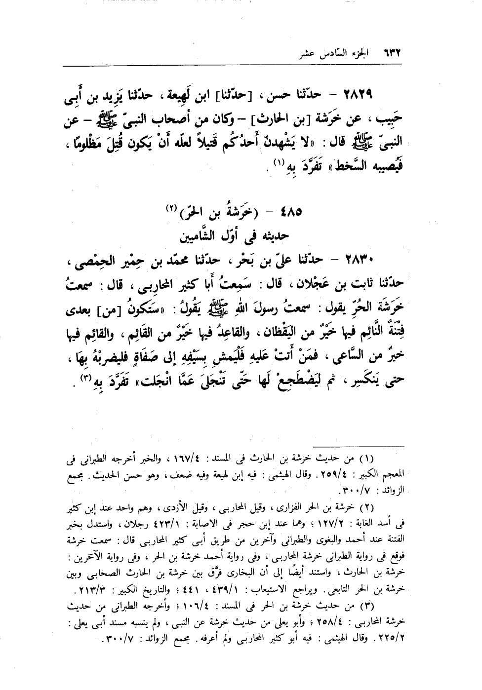2830 - حدثنا علي بن بحر، حدثنا محمد بن حمير الحمصي، حدثنا ثابت ابن عجلان، قال: سمعتُ أبا كثير المحاربي، قال: سمعتُ خرشة الحُر يقول: سمعتُ رسول الله - صلى الله عليه وسلم - يقول: (ستكون [من] بعدي فتنةٌ النائم فيها خيرٌ من اليقظان، والقاعدُ فيها خيرٌ من القائم، والقائم فيها خيرٌ من الساعي، فمن أتت عليه فليمش بسيفه إلى صفاةٍ فليضربه بها، حتى ينكسر، ثم ليضطجع لها حتى تنجلي عما انجلت) تفرد به (¬3) .