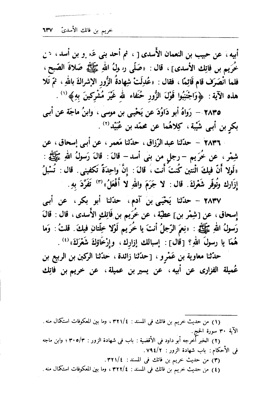 أبيه، عن حبيب بن النعمان الأسدي [، ثم أحد بني عمرو بن أسد، عن خُريم بن فاتك الأسدي] ، قال: (صلى رسولُ الله - صلى الله عليه وسلم - صلاةَ الصبح، فلما انصرف قام قائماً، فقال: (عُدلتْ شهادةُ الزور الإشراك بالله، ثم تلا هذه الآية: {وَاجْتَنِبُوا قَوْلَ الزُّورِ حُنَفَاءَ لِلَّهِ غَيْرَ مُشْرِكِينَ بِهِ} (¬1) .