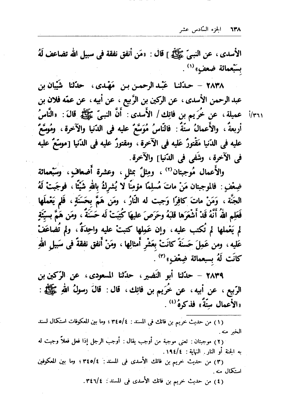 الأسدي، عن النبي - صلى الله عليه وسلم -] قال: (من أنفق نفقة في سبيل الله تضاعف لهُ بسبعمائة ضعفٍ) (¬1) .