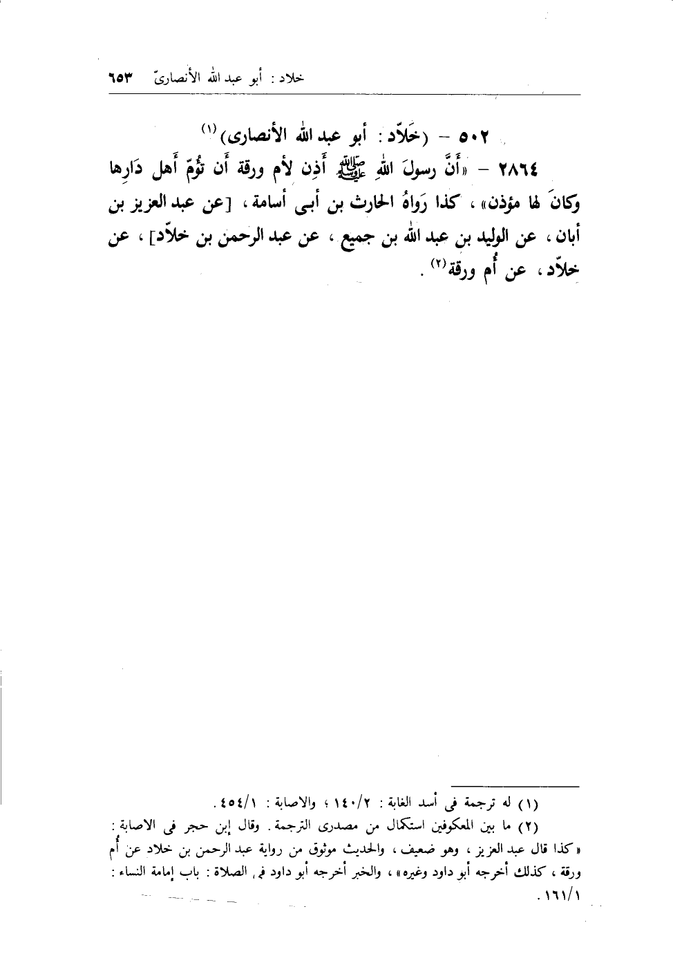 (¬2) مابين المعكوفين استكمال من مصدري الترجمة. وقال ابن حجر في الإصابة: (كذا قال عبد العزيز، وهو ضعيف، والحديث موثوق من رواية عبد الرحمن بن خلاد عن أم ورقة، كذلك أخرجه أبو داود وغيره) ، والخبر أخرجه أبو داود في الصلاة: باب إمامة النساء: 1/161.