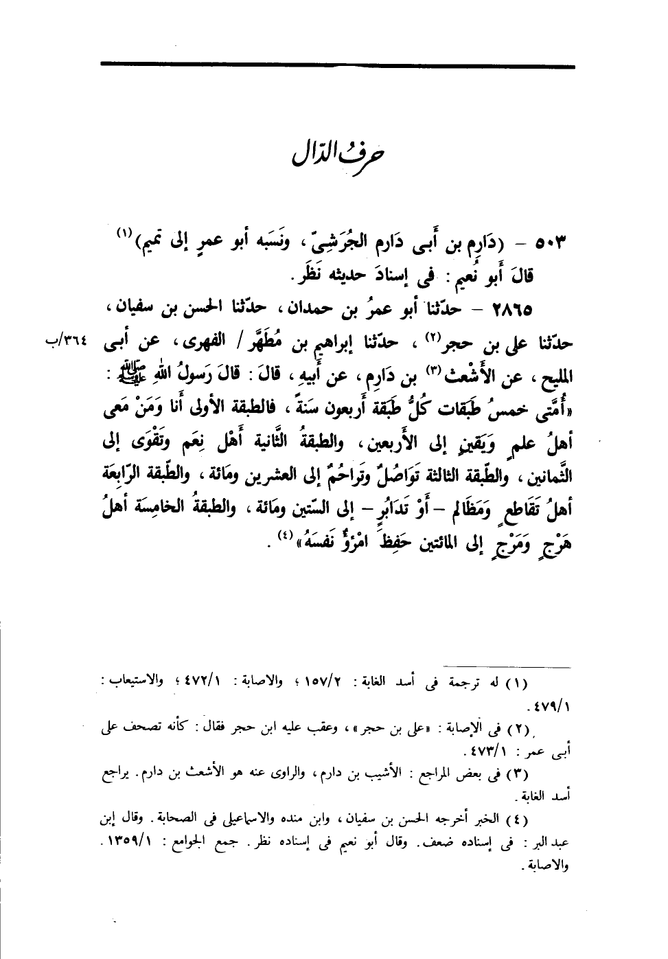 2865 - حدثنا أبو عمر بن حمدان، حدثنا الحسن بن سفيان، حدثنا علي ابن حجر (¬2) ، حدثنا إبراهيم بن مُطهَّر / الفهري، عن أبي المليح، عن الأشعث (¬3) ابن دارم، عن أبيه، قال: قال رسول الله - صلى الله عليه وسلم -: (أُمَّتى خمسُ طبقات كُلُّ طبقة أربعون سنةً، فالطبقة الأولى أنا ومن معي أهل علمٍ ويقين إلى الأربعين، والطبقة الثانية أهل نعم وتقوى إلى الثمانين، والطبقة الثالثة تواصلٌ وتراحمٌ إلى العشرين ومائة، والطبقة الرابعة أهلُ تقاطعٍ ومظالم - أو تدابر - إلى الستين ومائة، والطبقةُ الخامسة أهلُ هرجٍ ومرجٍ إلى المائتين حفظ امرؤٌ نفسهُ) (¬4) .