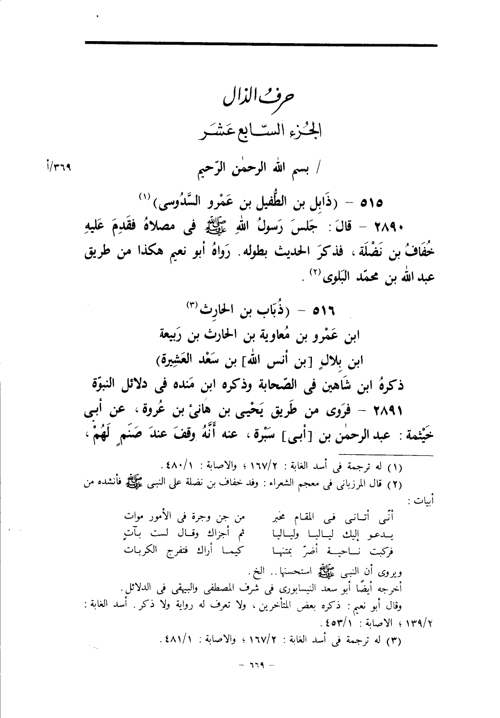 (¬2) قال المرزباني في معجم الشعراء: وفد خفاف بن نضلة عن النبي - صلى الله عليه وسلم - فأنشده من أبيات: