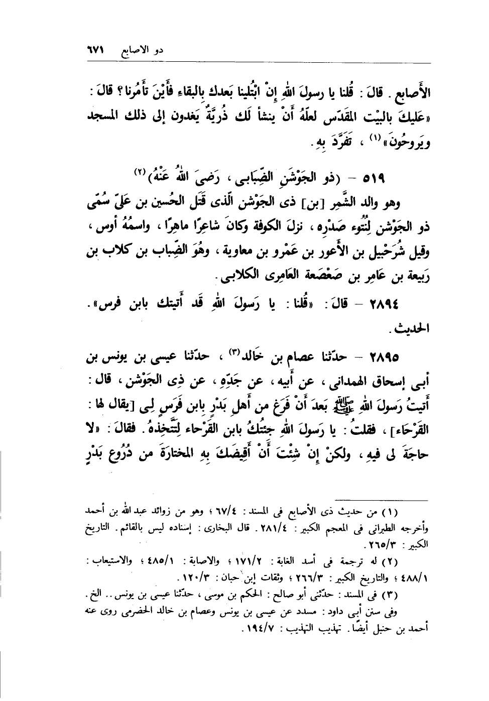 (¬1) من حديث ذي الأصابع في المستند: 4/67؛ وهو من زوائد عبد الله بن أحمد وأخرجه الطبراني في المعجم الكبير: 4/281. قال البخاري: إسناده ليس بالقائم. التاريخ الكبير: 3/265.