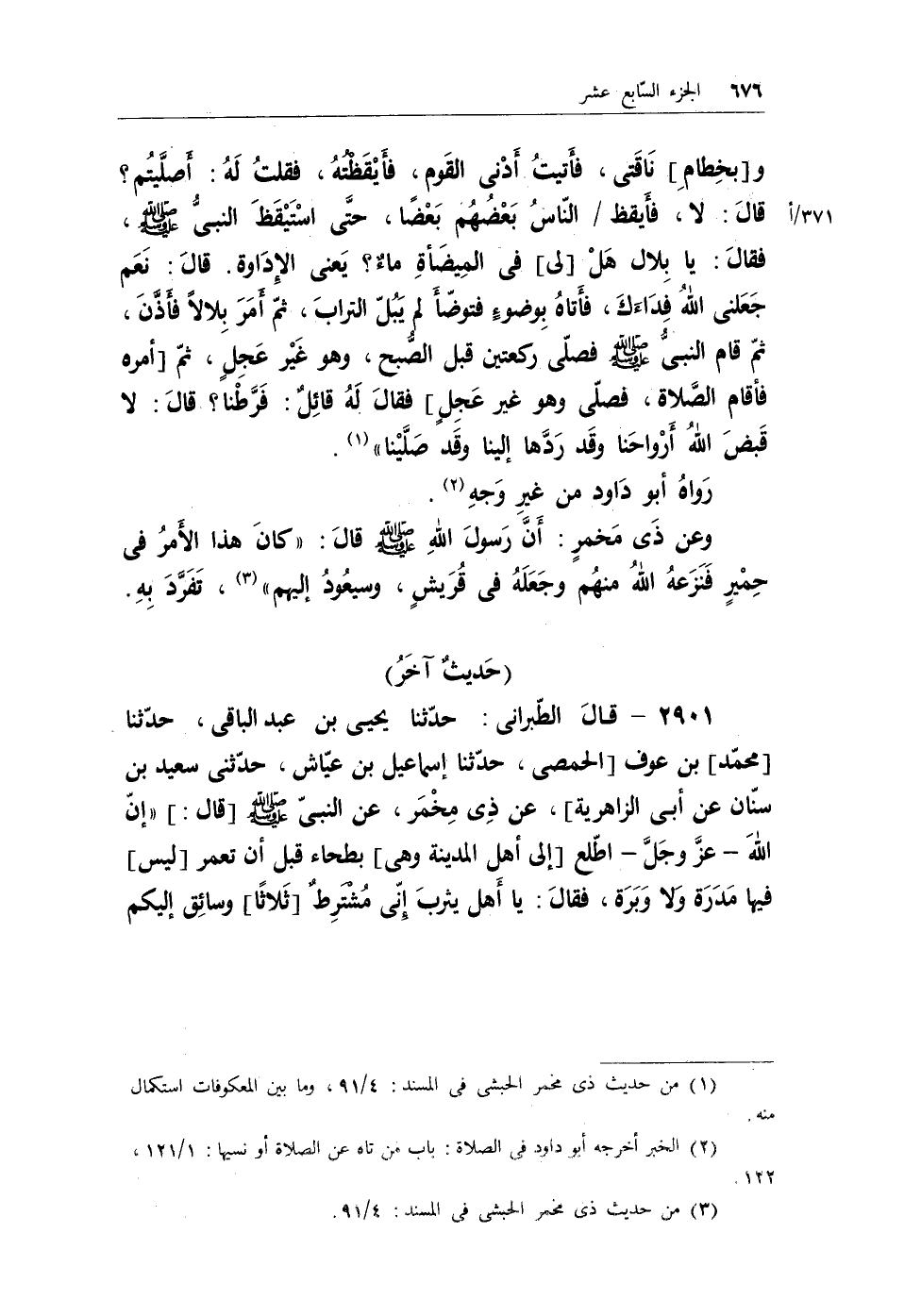 وعن ذي مخمرٍ: أنَّ رسول الله - صلى الله عليه وسلم - قال: (كان هذا الأمرُ في حميرٍ فنزعهُ الله منهم وجعلهُ في قُريشٍ، وسيعود إليهم) (¬3) ، تفرد به.