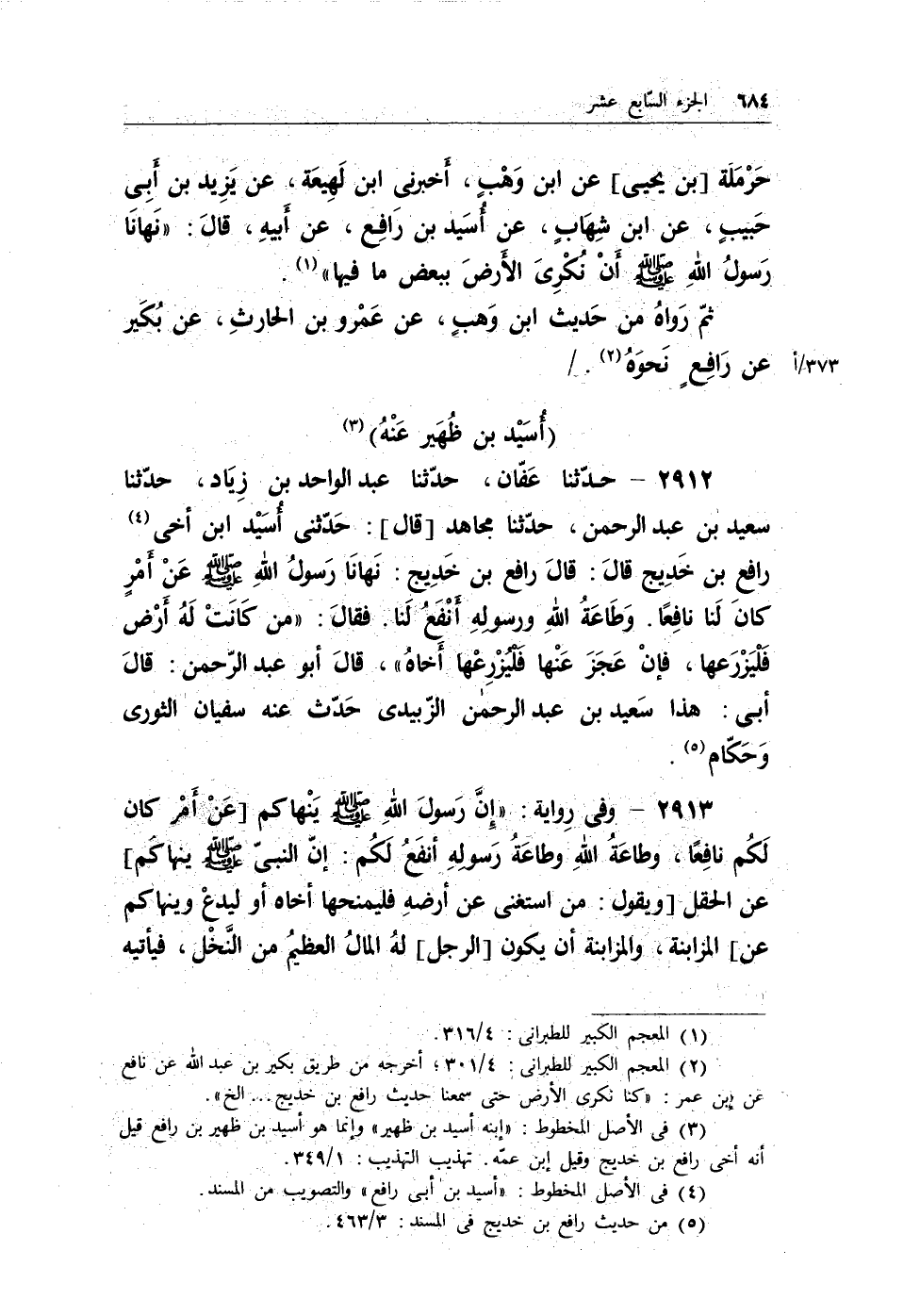حرملة [بن يحيى] عن ابن وهبٍ، أخبرني ابن لهيعة، عن يزيد بن أبي حبيبٍ، عن ابن شهابٍ، عن أُسيد بن رافع، عن أبيه، قال: (نهانا رسول الله - صلى الله عليه وسلم - أن نُكرى الأرض ببعض ما فيها) (¬1) .