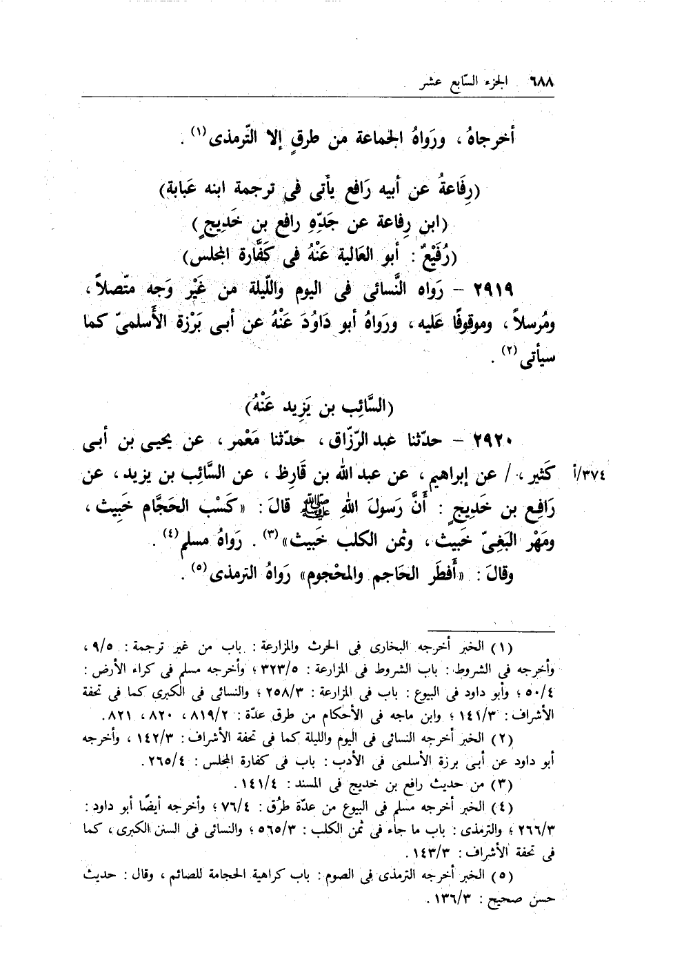2920 - حدثنا عبد الرزاق، حدثنا معمر، عن يحيى بن أبي كثير، / عن إبراهيم، عن عبد الله بن قارظ، عن السائب بن يزيد، عن رافع بن خديجٍ: أن رسول الله - صلى الله عليه وسلم - قال: (كسب الحجام خبيث، ومهر البغي خبيث، وثمن الكلب خبيث) (¬2) . رواهُ مسلم (¬3) .