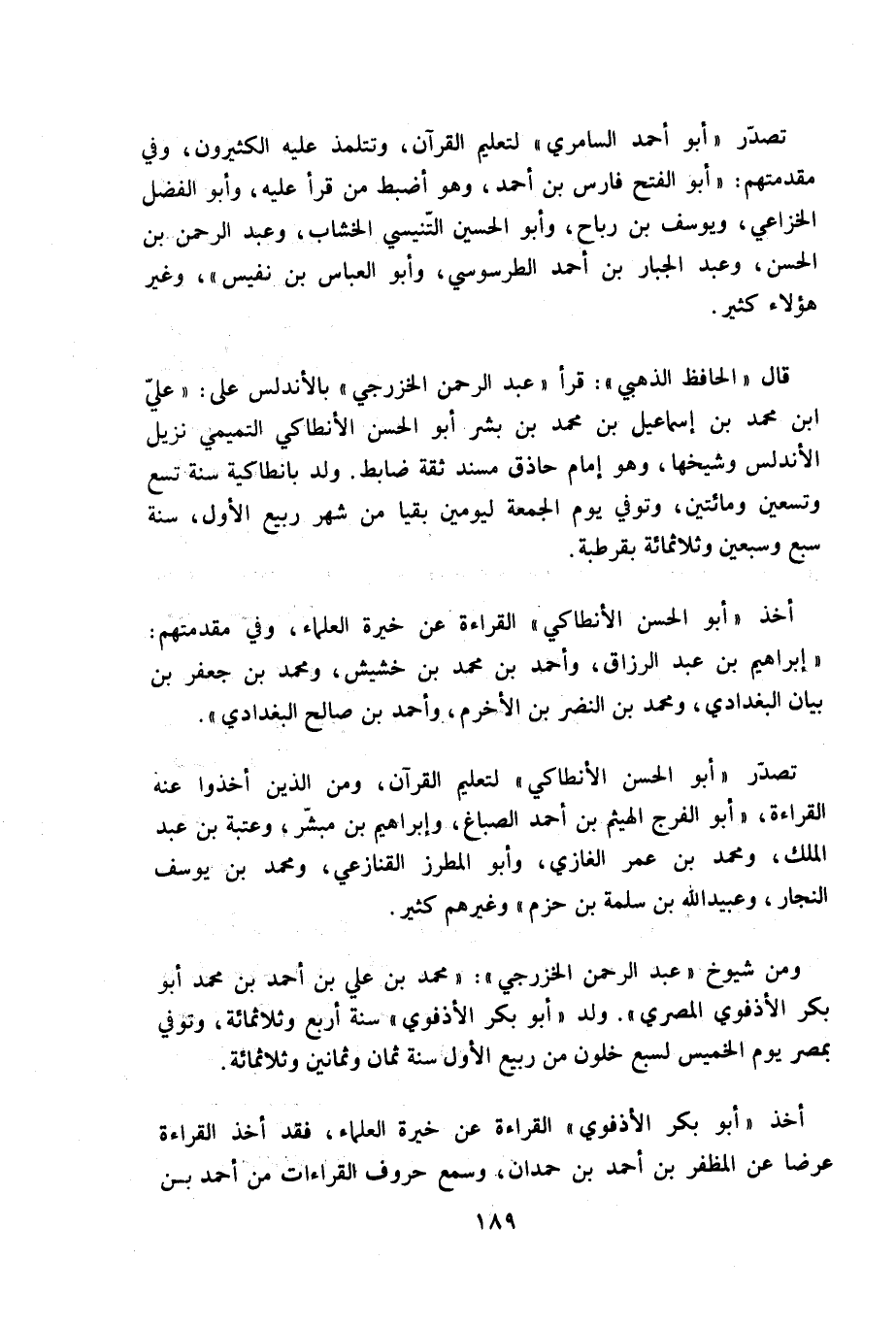 قال «الحافظ الذهبي»: قرأ «عبد الرحمن الخزرجي» بالأندلس على: «عليّ ابن محمد بن إسماعيل بن محمد بن بشر أبو الحسن الأنطاكي التميمي نزيل الأندلس وشيخها، وهو إمام حاذق مسند ثقة ضابط. ولد بانطاكية سنة تسع وتسعين ومائتين، وتوفي يوم الجمعة ليومين بقيا من شهر ربيع الأول، سنة سبع وسبعين وثلاثمائة بقرطبة.