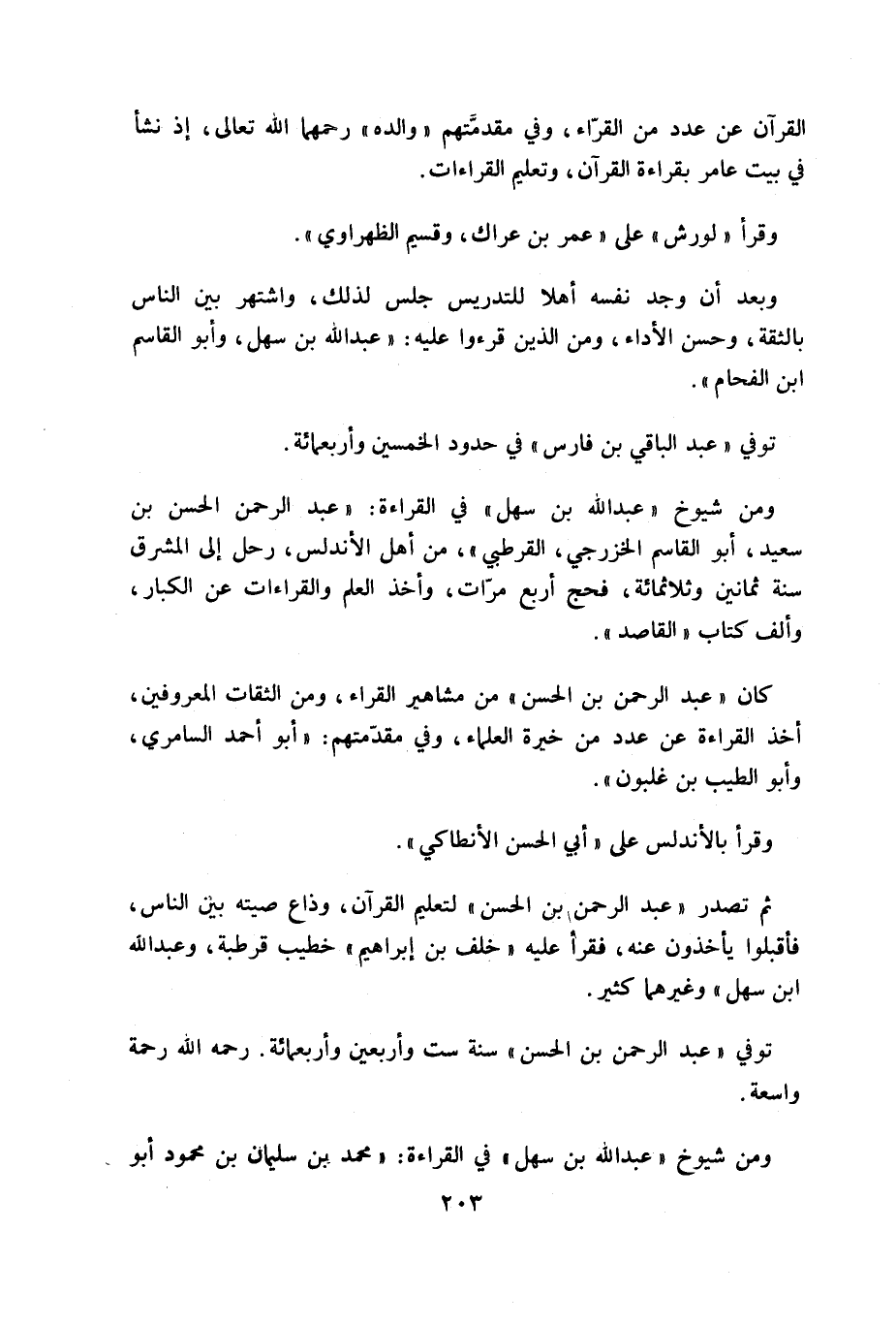 ومن شيوخ «عبد الله بن سهل» في القراءة: «عبد الرحمن الحسن بن سعيد، أبو القاسم الخزرجي، القرطبي»، من أهل الأندلس، رحل إلى المشرق سنة ثمانين وثلاثمائة، فحج أربع مرّات، وأخذ العلم والقراءات عن الكبار، وألف كتاب «المقاصد».