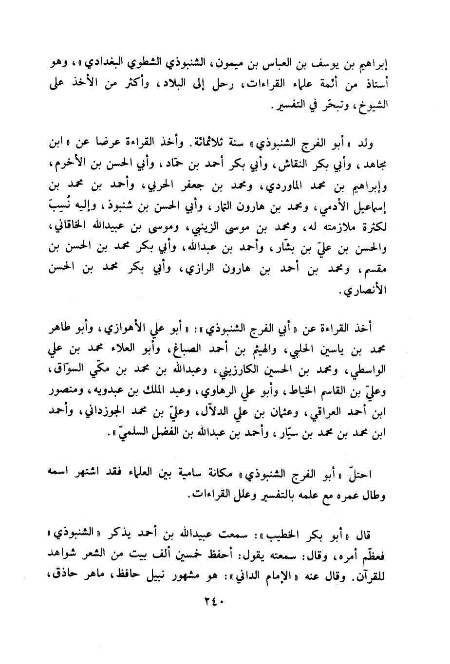 إبراهيم بن يوسف بن العباس بن ميمون، الشنبوذي الشطوي البغدادي»، وهو أستاذ من أئمة علماء القراءات، رحل إلى البلاد، وأكثر من الأخذ على الشيوخ، وتبحّر في التفسير.
