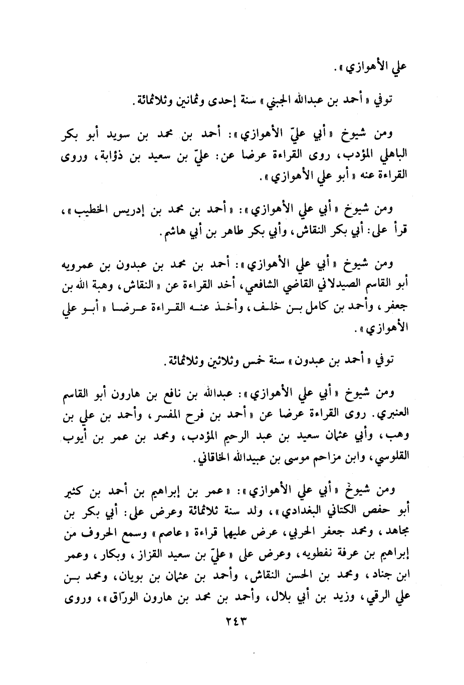 ومن شيوخ «أبي عليّ الأهوازي»: أحمد بن محمد بن سويد أبو بكر الباهلي المؤدب، روى القراءة عرضا عن: عليّ بن سعيد بن ذؤابة، وروى القراءة عنه «أبو علي الأهوازي».