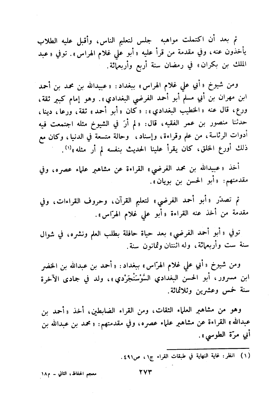 ومن شيوخ «أبي علي غلام الهراس» ببغداد: «عبيد الله بن محمد بن أحمد ابن مهران بن أبي مسلم أبو أحمد الفرضي البغدادي». وهو إمام كبير ثقة، ورع، قال عنه «الخطيب البغدادي»: «كان «أبو أحمد» ثقة، ورعا، دينا، حدثنا منصور بن عمر الفقيه، قال: «لم أر في الشيوخ مثله اجتمعت فيه أدوات الرئاسة، من علم وقراءة، وإسناد، وحالة متسعة في الدنيا، وكان مع ذلك أورع الخلق، كان يقرأ علينا الحديث بنفسه لم أر مثله» (¬1).
