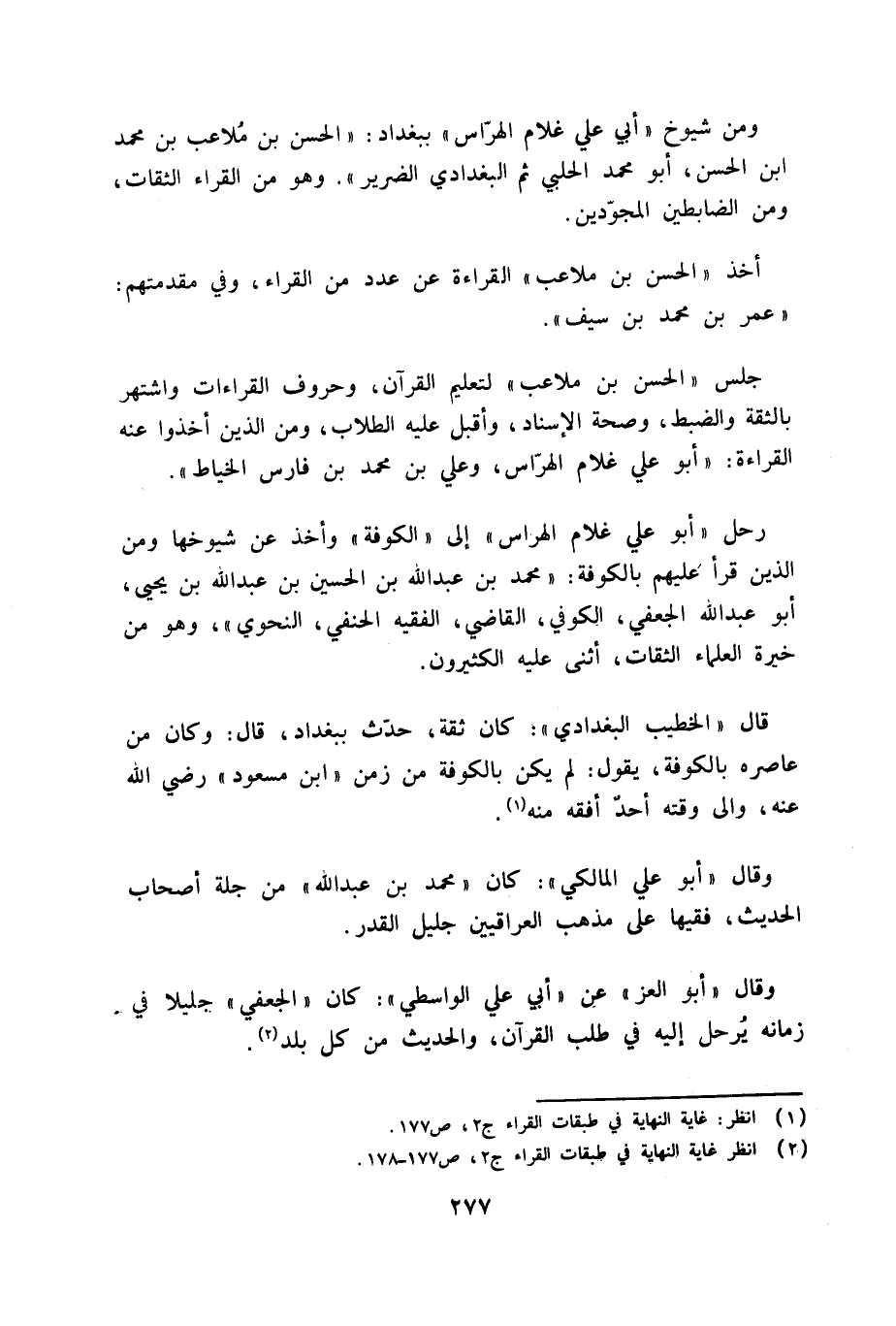 ومن شيوخ «أبي علي غلام الهرّاس» ببغداد: «الحسن بن ملاعب بن محمد ابن الحسن، أبو محمد الحلبي ثم البغدادي الضرير». وهو من القراء الثقات، ومن الضابطين المجوّدين.