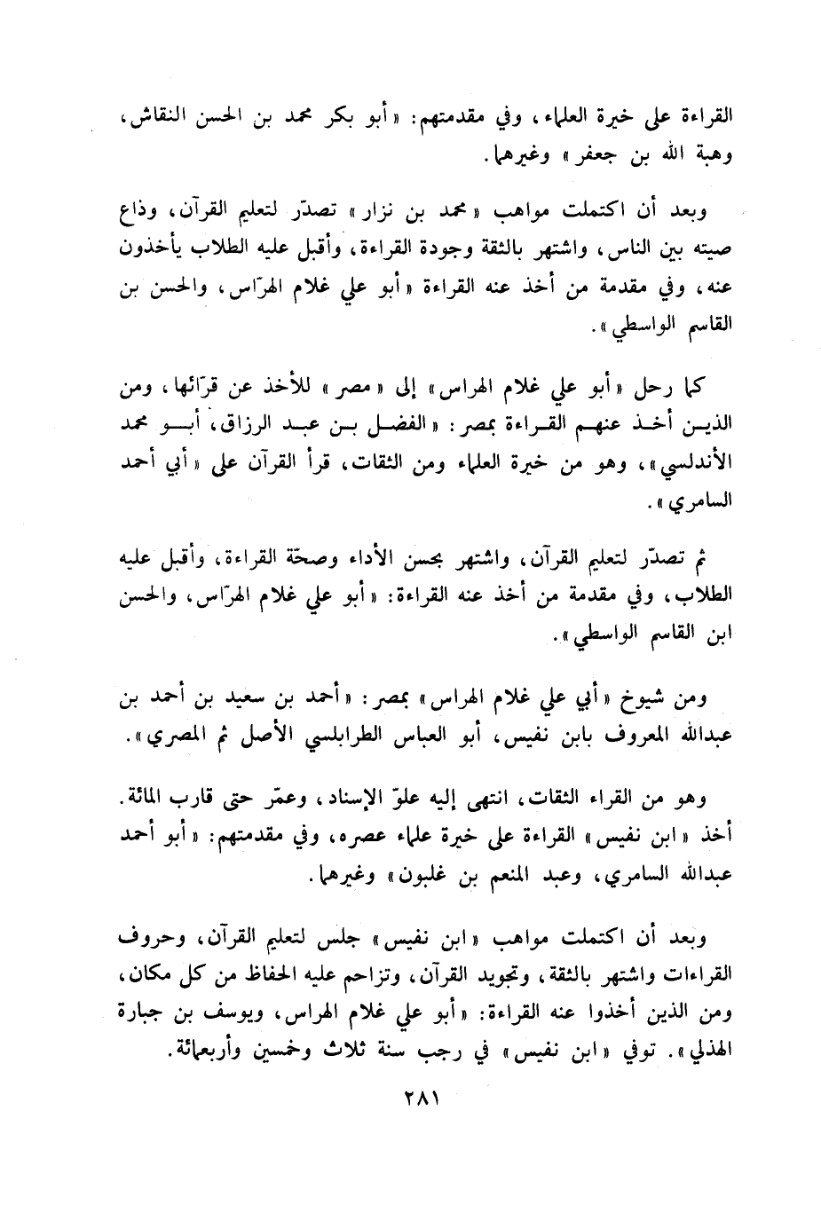القراءة على خيرة العلماء، وفي مقدمتهم: «أبو بكر محمد بن الحسن النقاش، وهبة الله بن جعفر» وغيرهما.