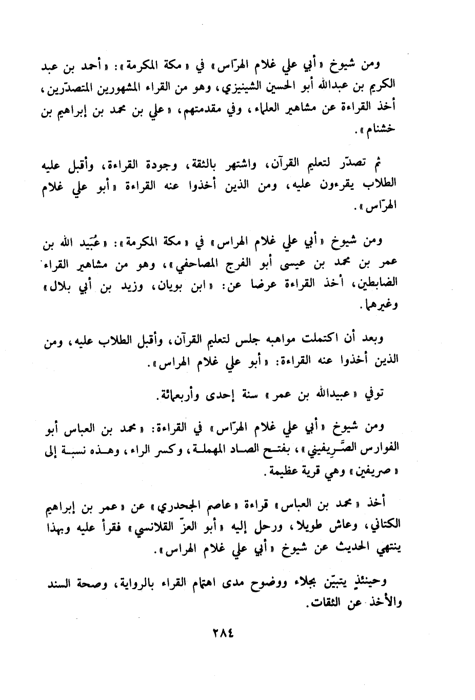 ومن شيوخ «أبي علي غلام الهراس» في «مكة المكرمة»: «عبيد الله بن عمر بن محمد بن عيسى أبو الفرج المصاحفي»، وهو من مشاهير القراء الضابطين، أخذ القراءة عرضا عن: «ابن بويان، وزيد بن أبي بلال» وغيرهما.