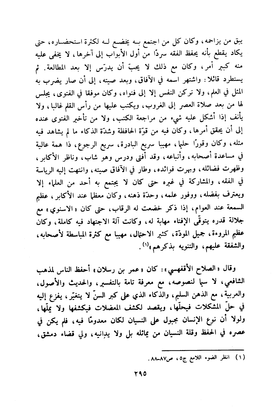 وقال «الصلاح الأقفهسي»: كان «عمر بن رسلان» أحفظ الناس لمذهب الشافعي، لا سيما لنصوصه، مع معرفة تامة بالتفسير، والحديث والأصول، والعربية، مع الذهن السليم، والذكاء الذي على كبر السنّ لا يتغيّر، يفزع إليه في حلّ المشكلات فيحلّها، ويقصد لكشف المعضلات فيكشفها ولا يملّها، ولولا أن نوع الإنسان مجبول على النسيان لكان معدوما فيه، فلم يكن في عصره في الحفظ وقلة النسيان من يماثله بل ولا يدانيه، ولي قضاء دمشق،
