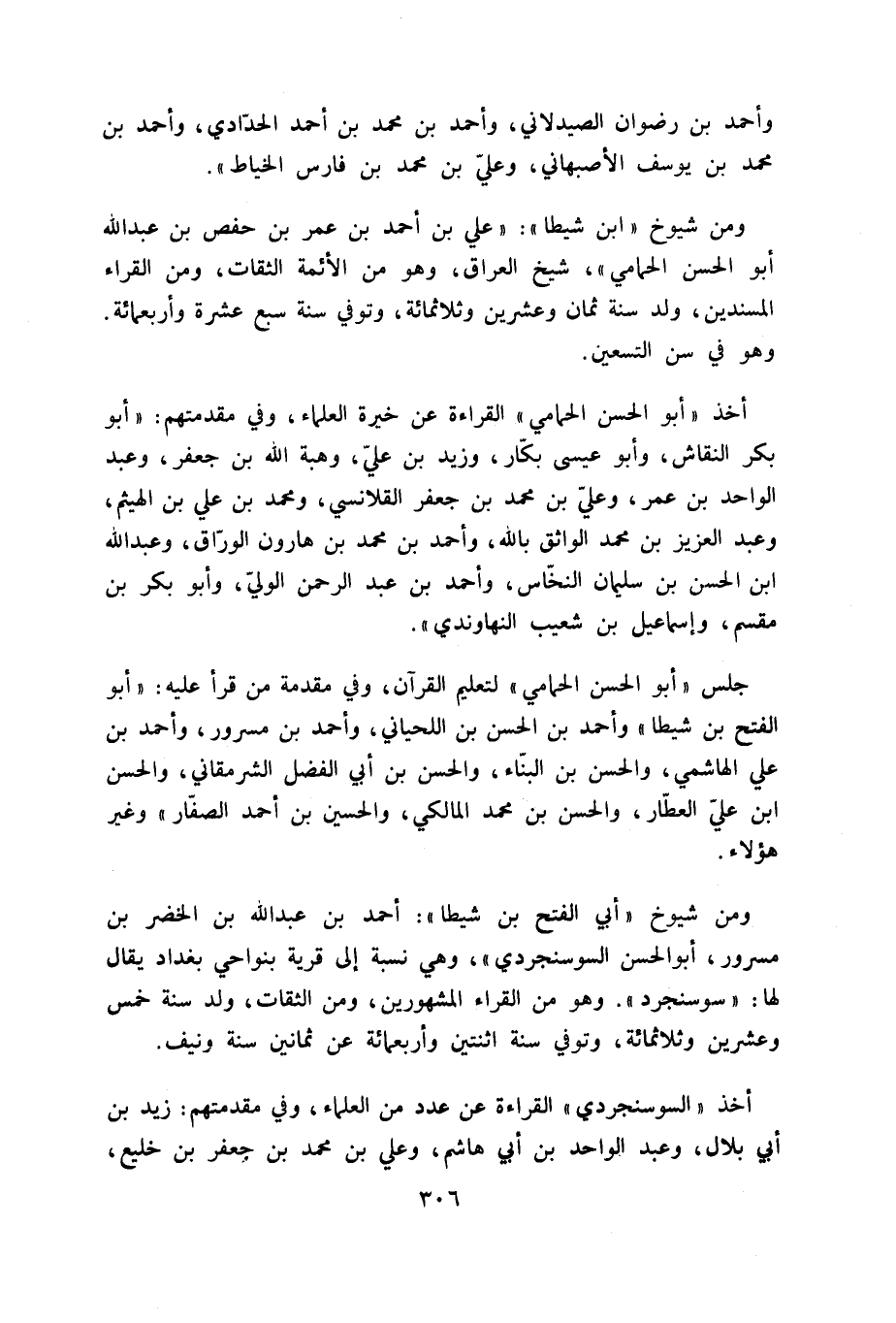 ومن شيوخ «ابن شيطا»: «علي بن أحمد بن عمر بن حفص بن عبد الله أبو الحسن الحمامي»، شيخ العراق، وهو من الأئمة الثقات، ومن القراء المسندين، ولد سنة ثمان