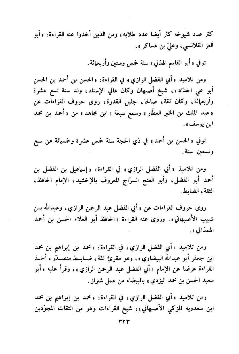 ومن تلاميذ «أبي الفضل الرازي» في القراءة: «الحسن بن أحمد بن الحسن أبو علي الحدّاد»، شيخ أصبهان وكان عالي الإسناد، ولد سنة تسع عشرة وأربعمائة، وكان ثقة، صالحا، جليل القدرة، روى حروف القراءات عن «عبد الملك بن الخير العطّار» وسمع سبعة «ابن مجاهد» من «أحمد بن محمد ابن يوسف».