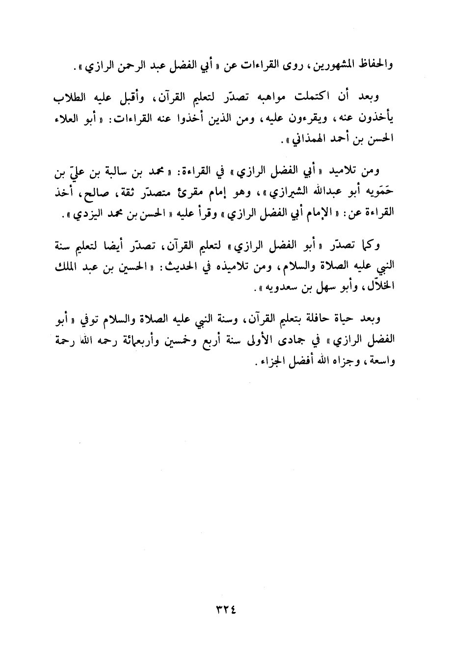 وبعد حياة حافلة بتعليم القرآن، وسنة النبي عليه الصلاة والسلام توفي «أبو الفضل الرازي» في جمادى الأولى سنة أربع وخمسين وأربعمائة رحمه الله رحمة واسعة، وجزاه الله أفضل الجزاء.