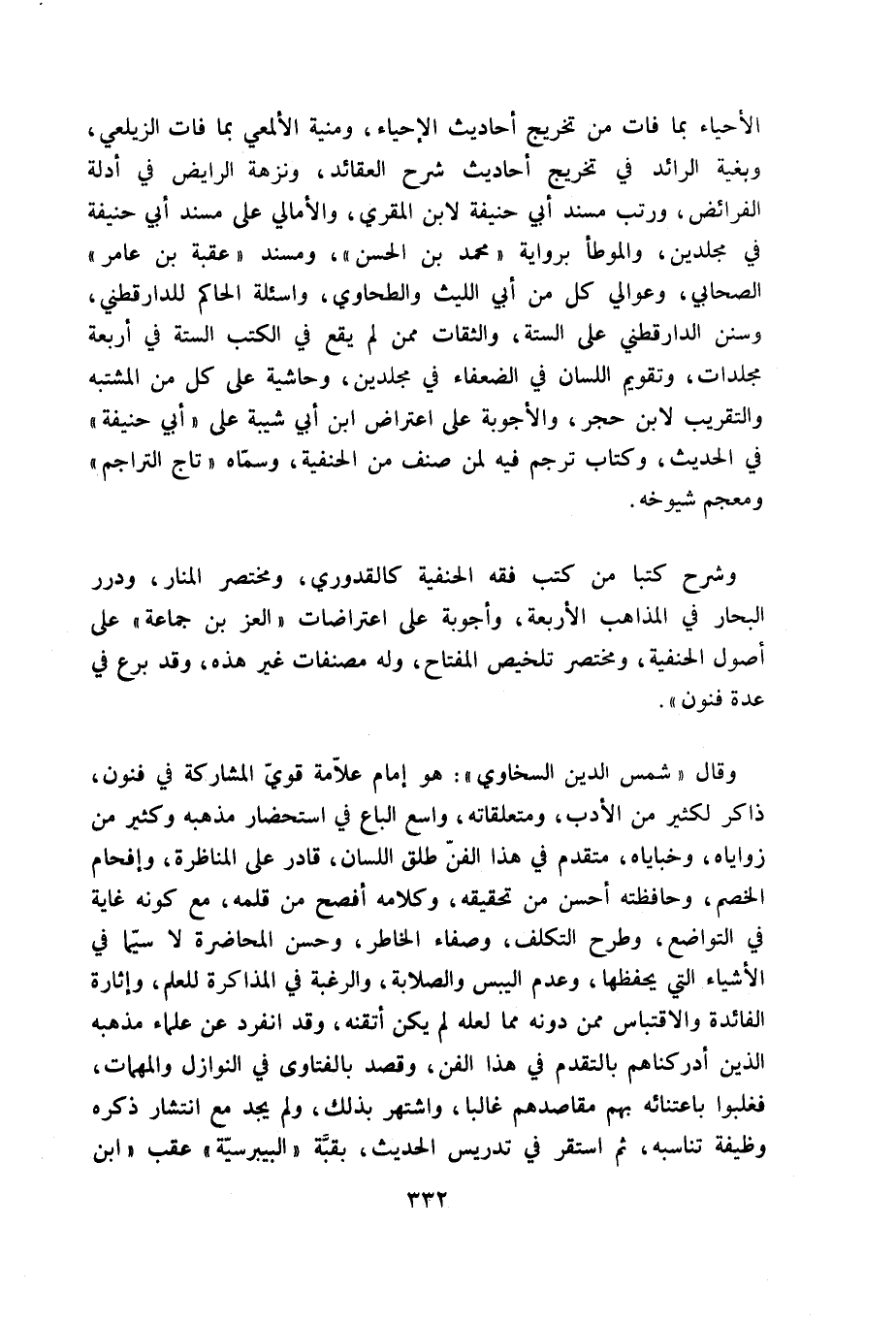 وشرح كتبا من كتب فقه الحنفية كالقدوري، ومختصر المنار، ودرر البحار في المذاهب الأربعة، وأجوبة على اعتراضات «العز بن جماعة» على أصول الحنفية، ومختصر تلخيص المفتاح، وله مصنفات غير هذه، وقد برع في عدة فنون».