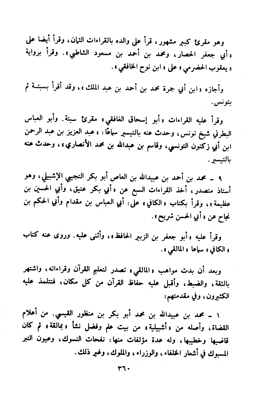 9 - محمد بن أحمد بن عبيد الله بن العاص أبو بكر التجيبي الإشبيلي، وهو أستاذ متصدر، أخذ القراءات السبع عن «أبي بكر عتيق، وأبي الحسين بن عظيمة»، وقرأ بكتاب «الكافي» على: أبي العباس بن مقدام وأبي الحكم بن نجاح عن «أبي الحسن شريح».