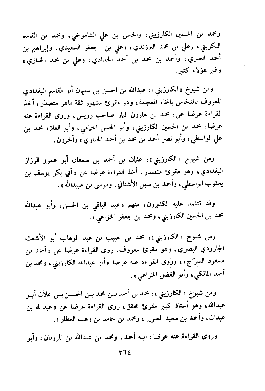 ومن شيوخ «الكارزيني»: محمد بن أحمد بن محمد بن الحسن بن علّان أبو عبد الله، وهو أستاذ كبير مقرئ محقق، روى القراءة عرضا عن «عبد الله بن عبدان، وأحمد بن سعيد الضرير، ومحمد بن حامد بن وهب العطار».