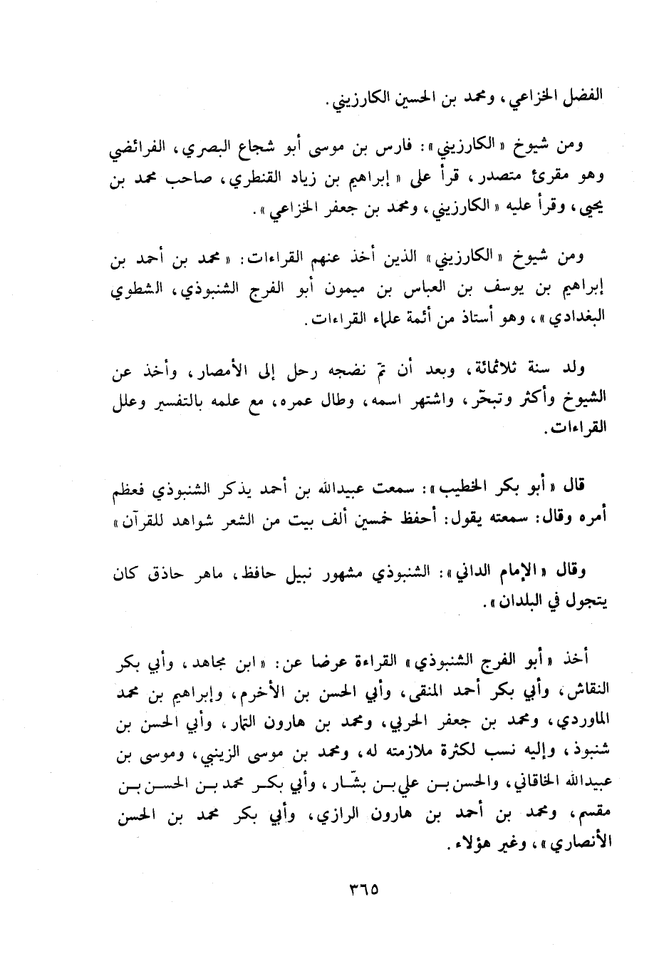 ومن شيوخ «الكارزيني» الذين أخذ عنهم القراءات: «محمد بن أحمد بن إبراهيم بن يوسف بن العباس بن ميمون أبو الفرج الشنبوذي، الشطوي البغدادي»، وهو أستاذ من أئمة علماء القراءات.