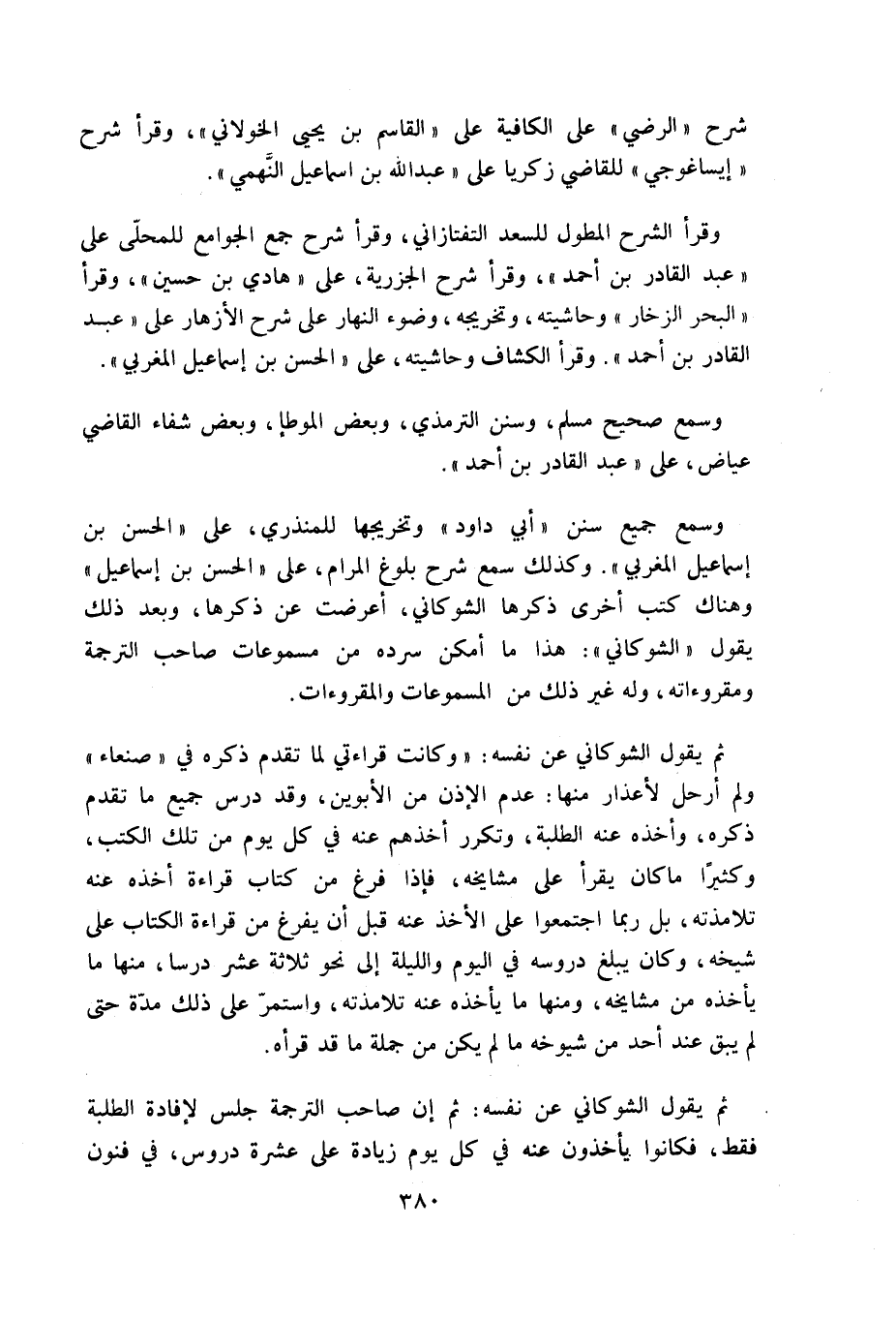 ثم يقول الشوكاني عن نفسه: «وكانت قراءتي لما تقدم ذكره في «صنعاء» ولم أرحل لأعذار منها: عدم الإذن من الأبوين، وقد درس جميع ما تقدم ذكره، وأخذه عنه الطلبة، وتكرر أخذهم عنه في كل يوم من تلك الكتب، وكثيرا ما كان يقرأ على مشايخه، فإذا فرغ من كتاب قراءة أخذه عنه تلامذته، بل ربما اجتمعوا على الأخذ عنه قبل أن يفرغ من قراءة الكتاب على شيخه، وكان يبلغ دروسه في اليوم والليلة إلى نحو ثلاثة عشر درسا، منها ما يأخذه من مشايخه، ومنها ما يأخذه عنه تلامذته، واستمرّ على ذلك مدّة حتى لم يبق عند أحد من شيوخه ما لم يكن من جملة ما قد قرأه.